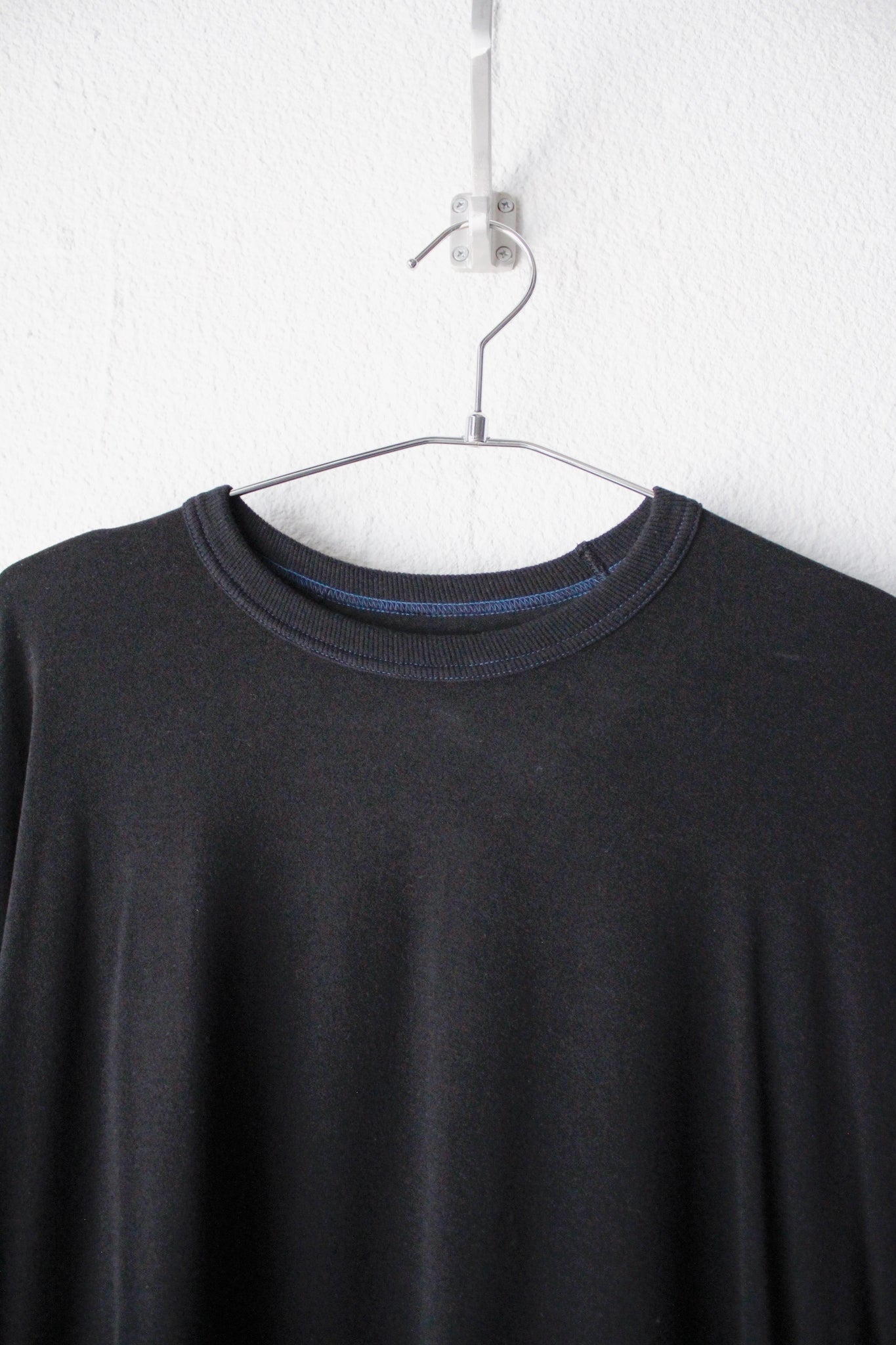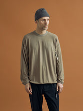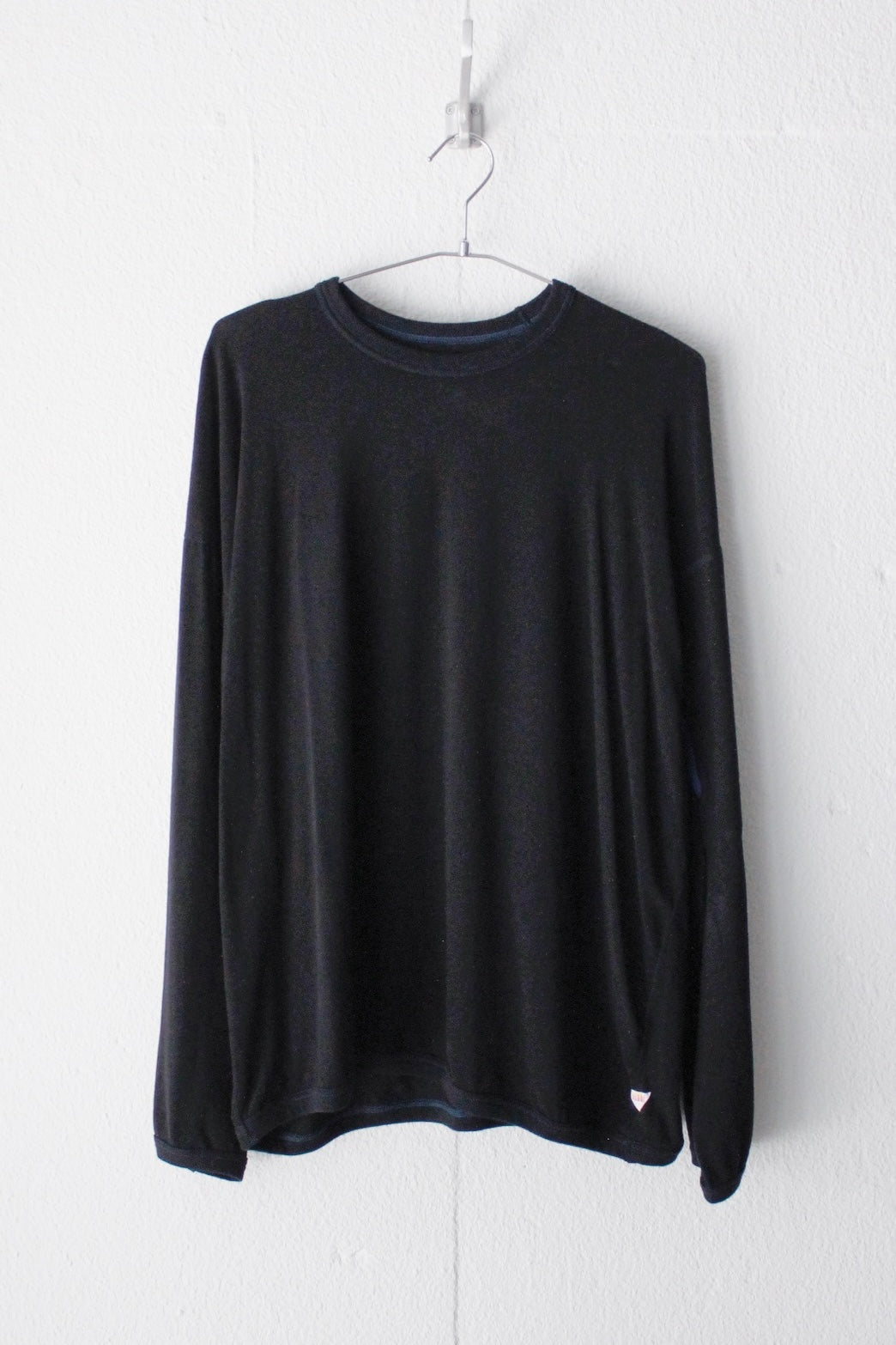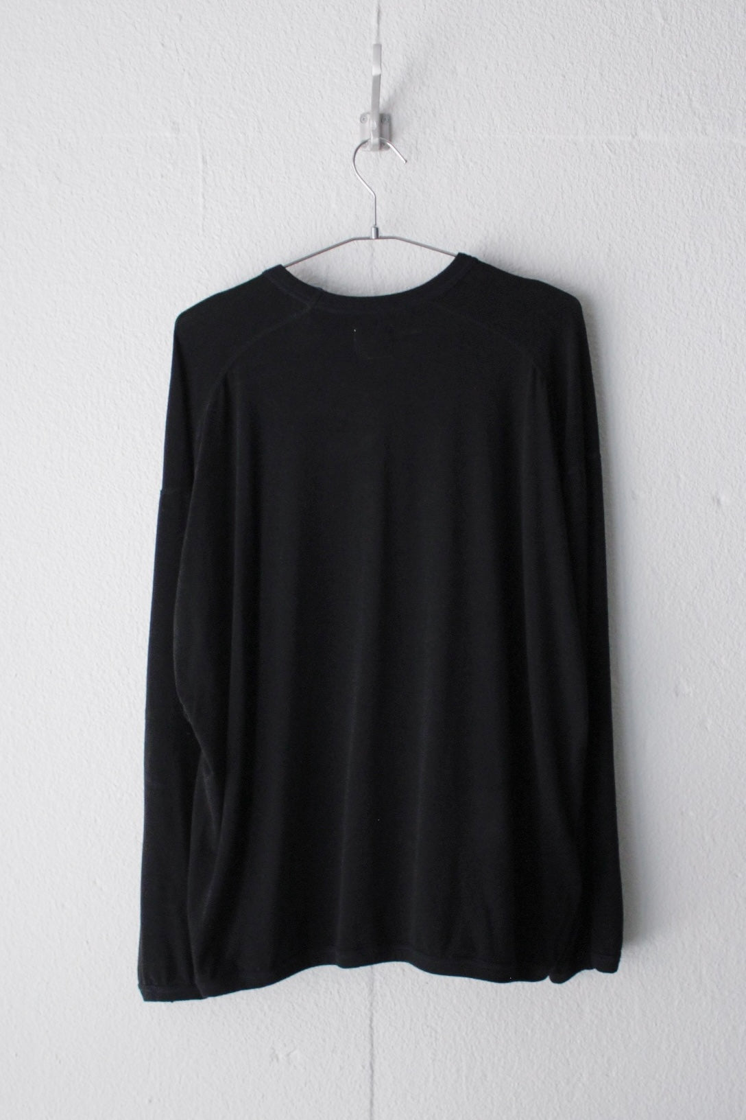 襟、袖口、裾はテレコのバインディングを施しロンTee以上スウェット未満の雰囲気に仕上げている。