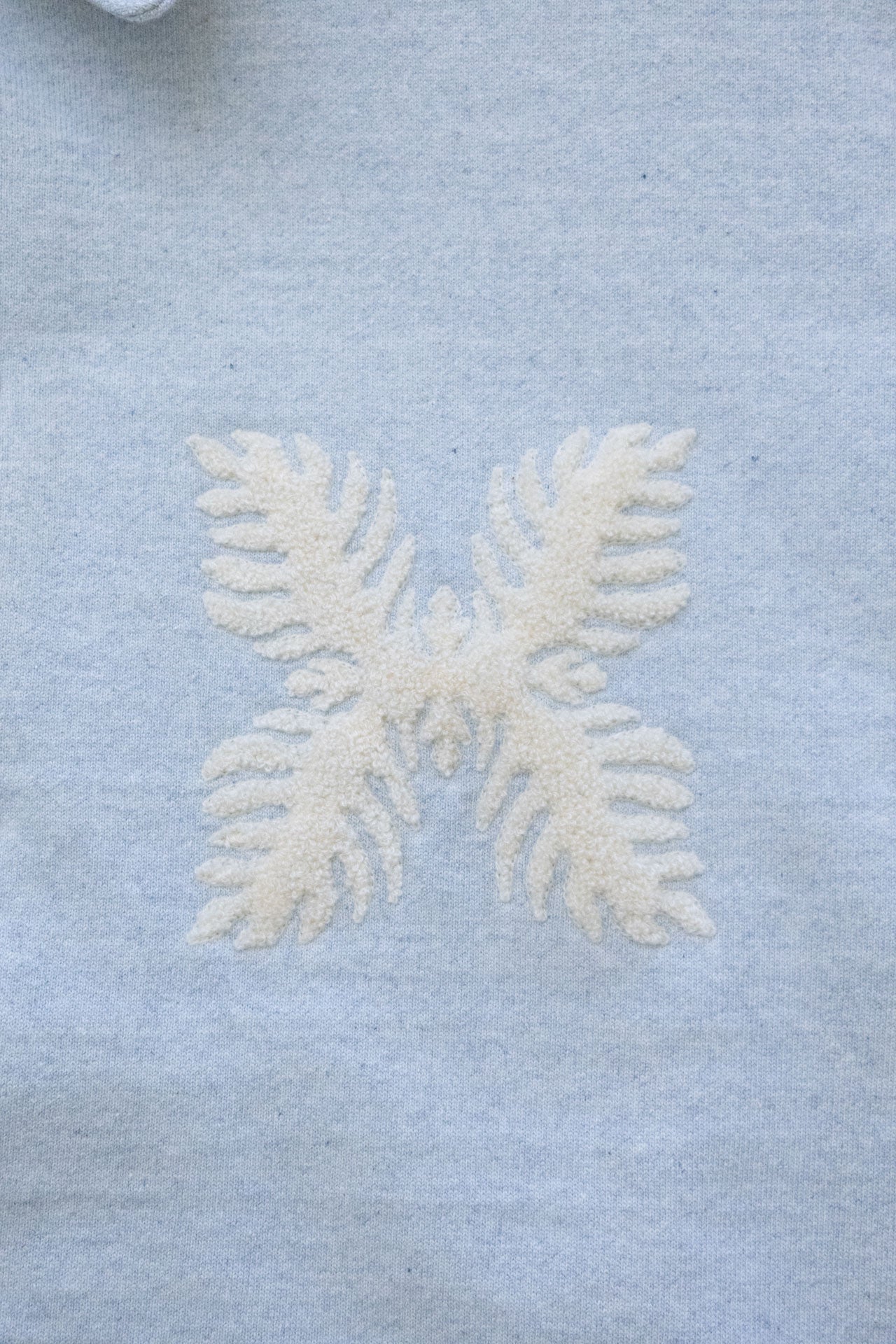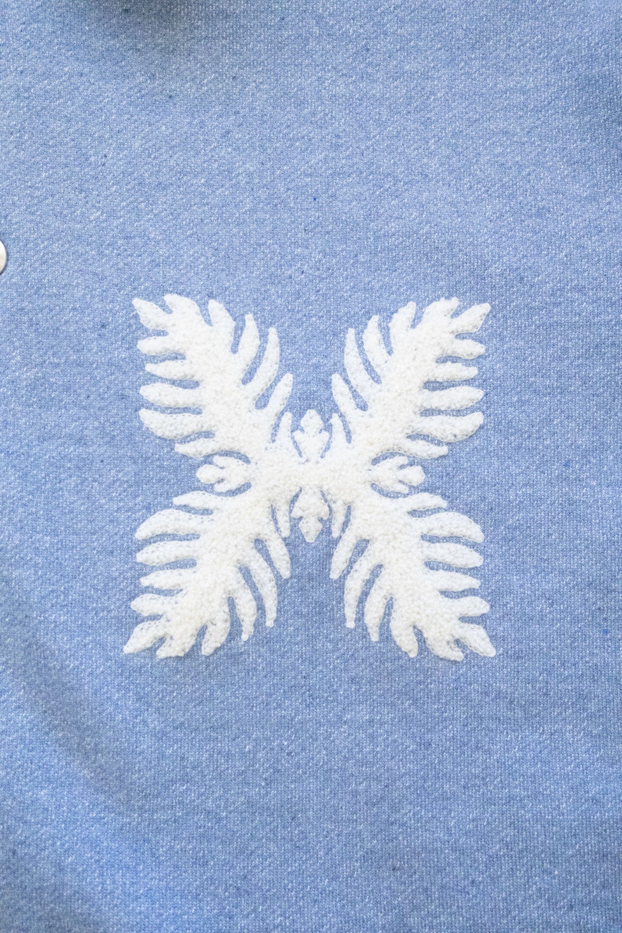胸元にはハワイで祝い事や装飾に使われる伝統植物「ラウアエ」をモチーフにしたサガラ刺繍を配置。ブランドのルーツを感じさせるアクセントが、シンプルなデザインに温かみを添えています。