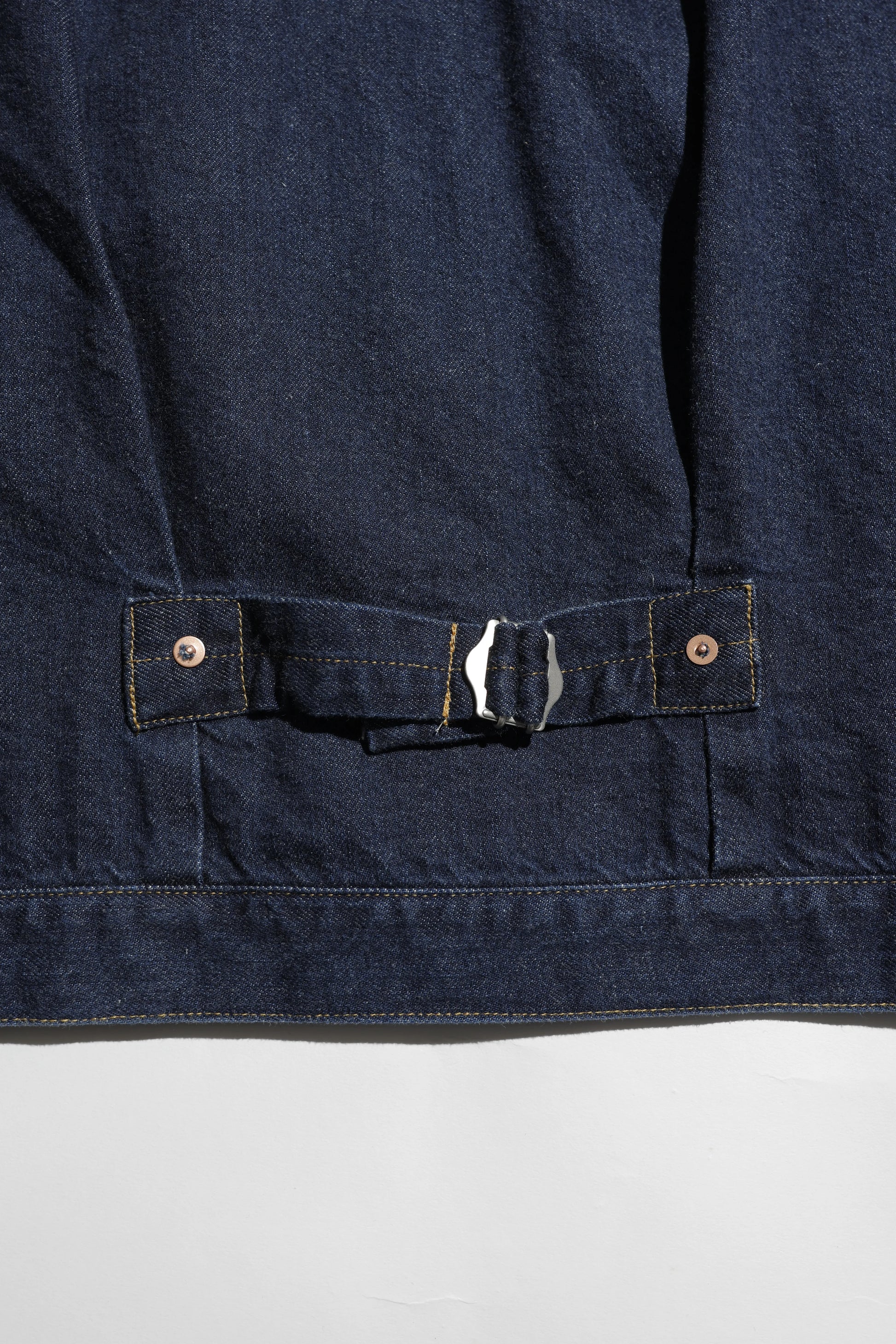 使用されているのは、日本のデニム産地・岡山で丁寧に織り上げられたセルビッチデニム。しっかりとした生地は着込むほどに身体に馴染み、色落ちやアタリといった経年変化を楽しめます。