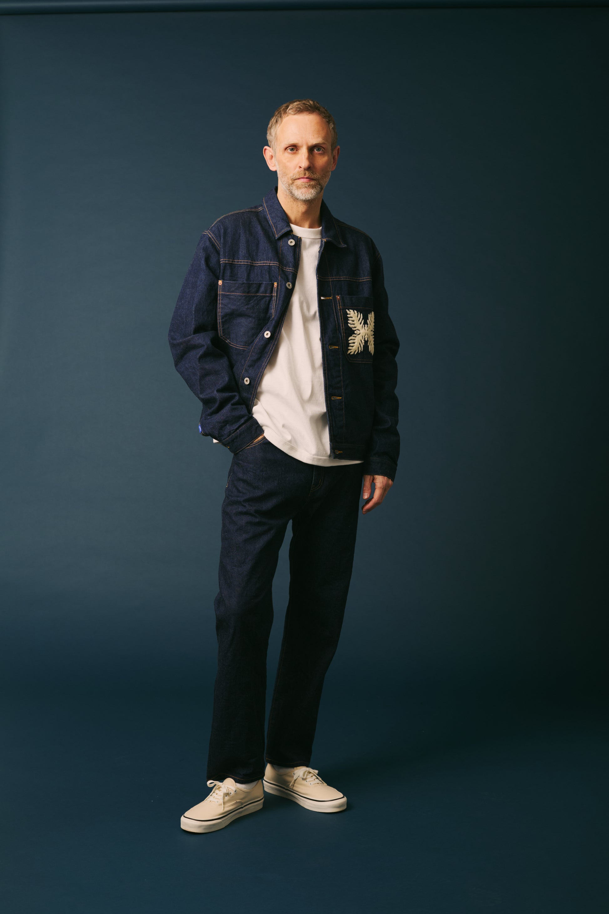 ホノルル発のライフスタイルブランド 「SALVAGE PUBLIC」 が手掛けるデニムジャケットは、ブランドを象徴する Lauaʻe(ラウアエ) を大胆にサガラ刺繍で表現。伝統的な植物のモチーフが、無骨なデニムに鮮やかな存在感を与えます。
