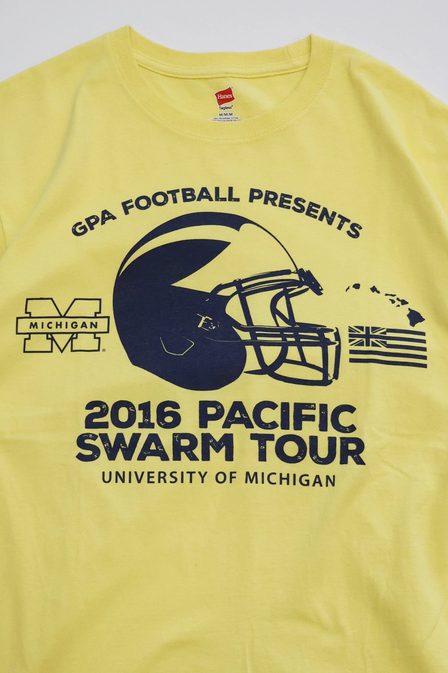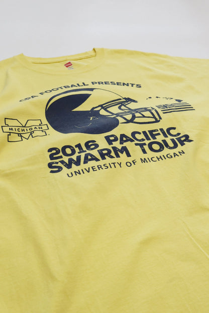 正面には大学の象徴的なウルヴァリンヘルメットとハワイ州旗、そして“2016 PACIFIC SWARM TOUR”の文字が堂々とプリントされています。ミシガンの名門らしい存在感のある1枚。