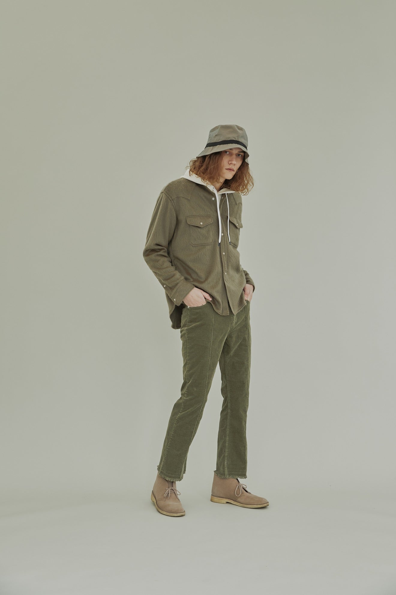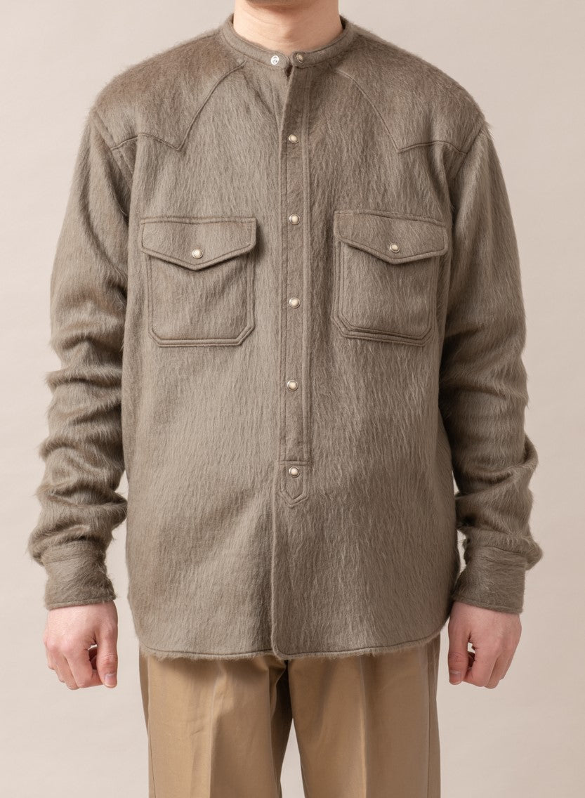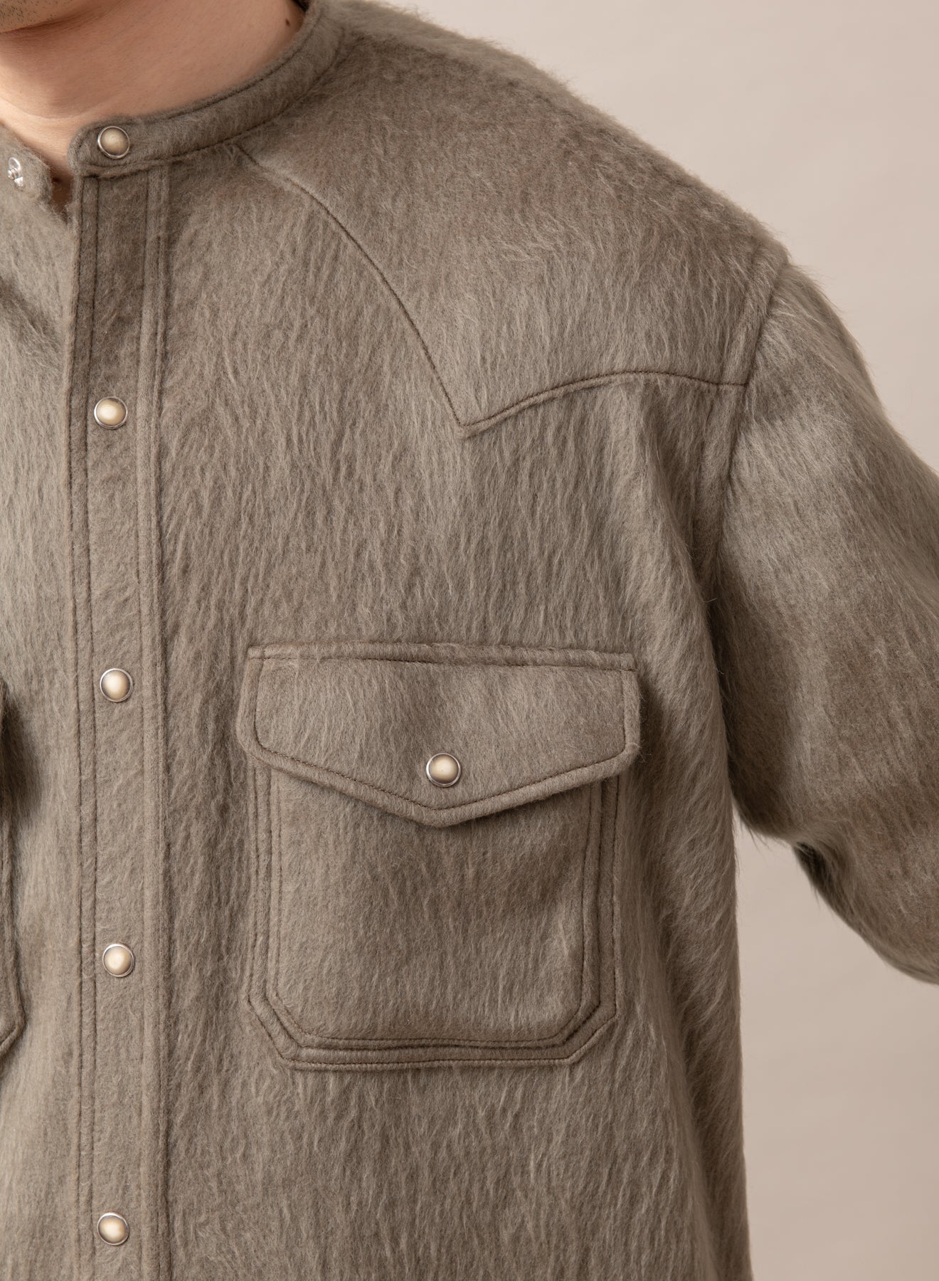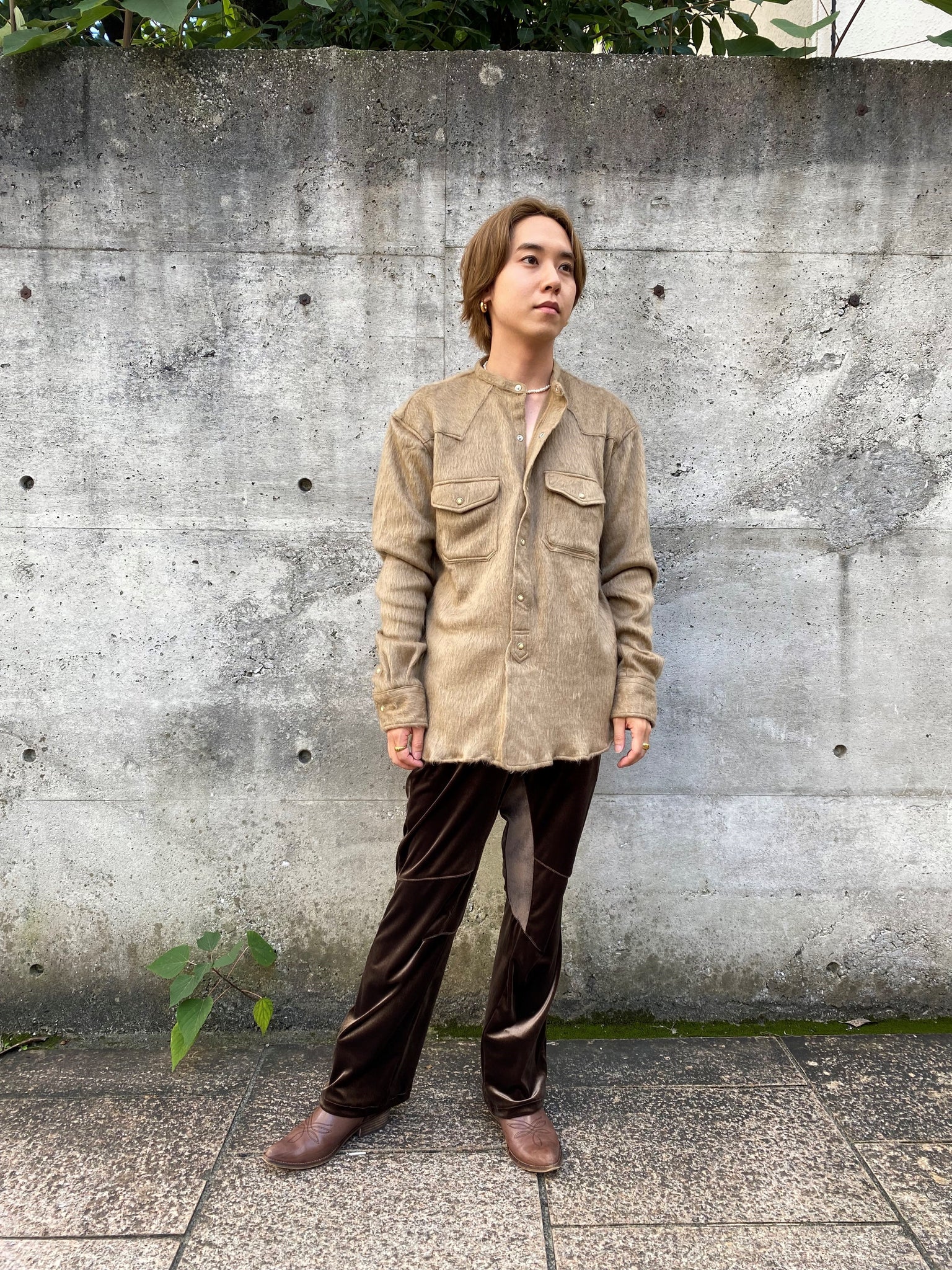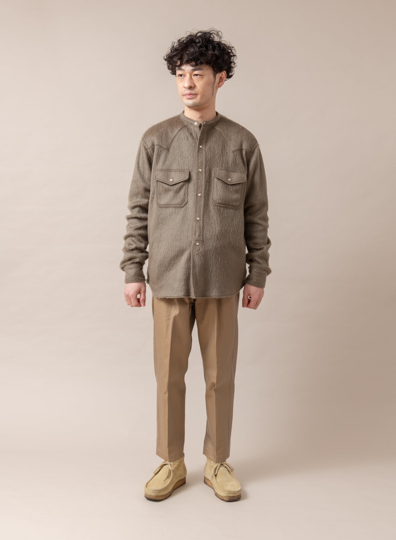 襟はバンドカラーにアレンジしたウエスタンディティールのオーバーシャツはザックリとしたシルエットでシャツジャケットとして羽織ってもらいたい。