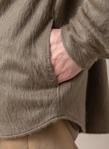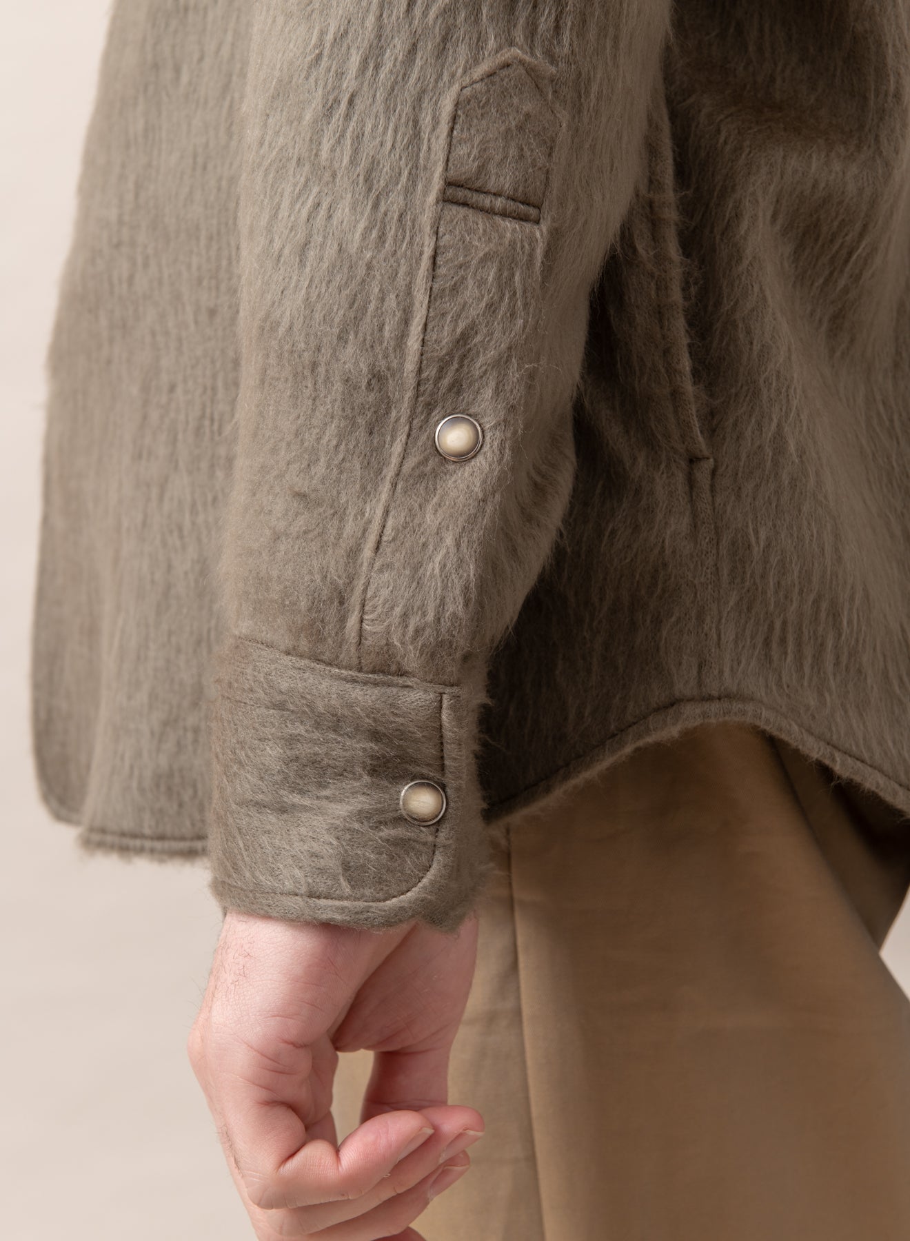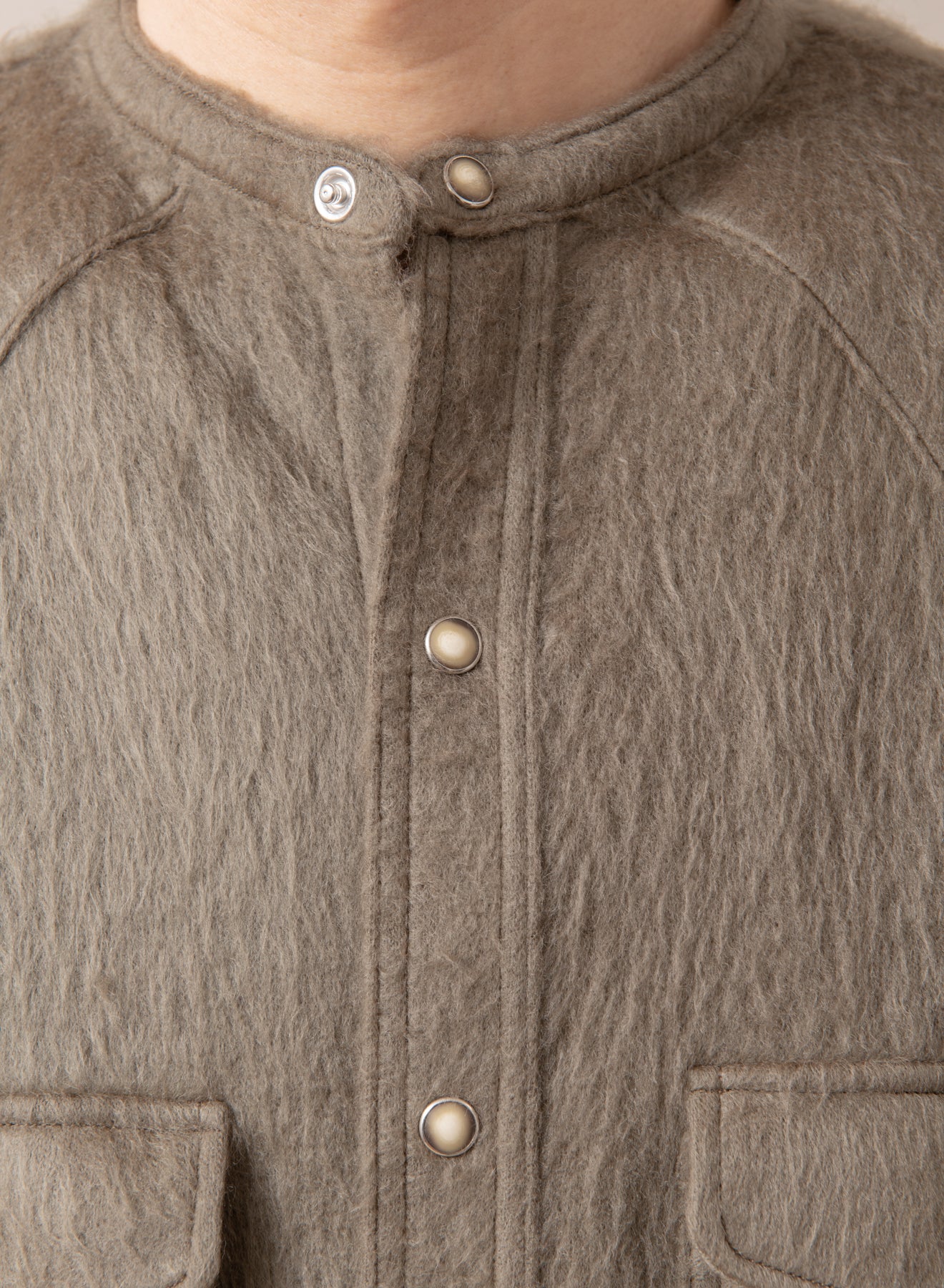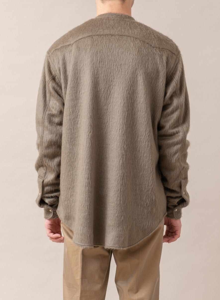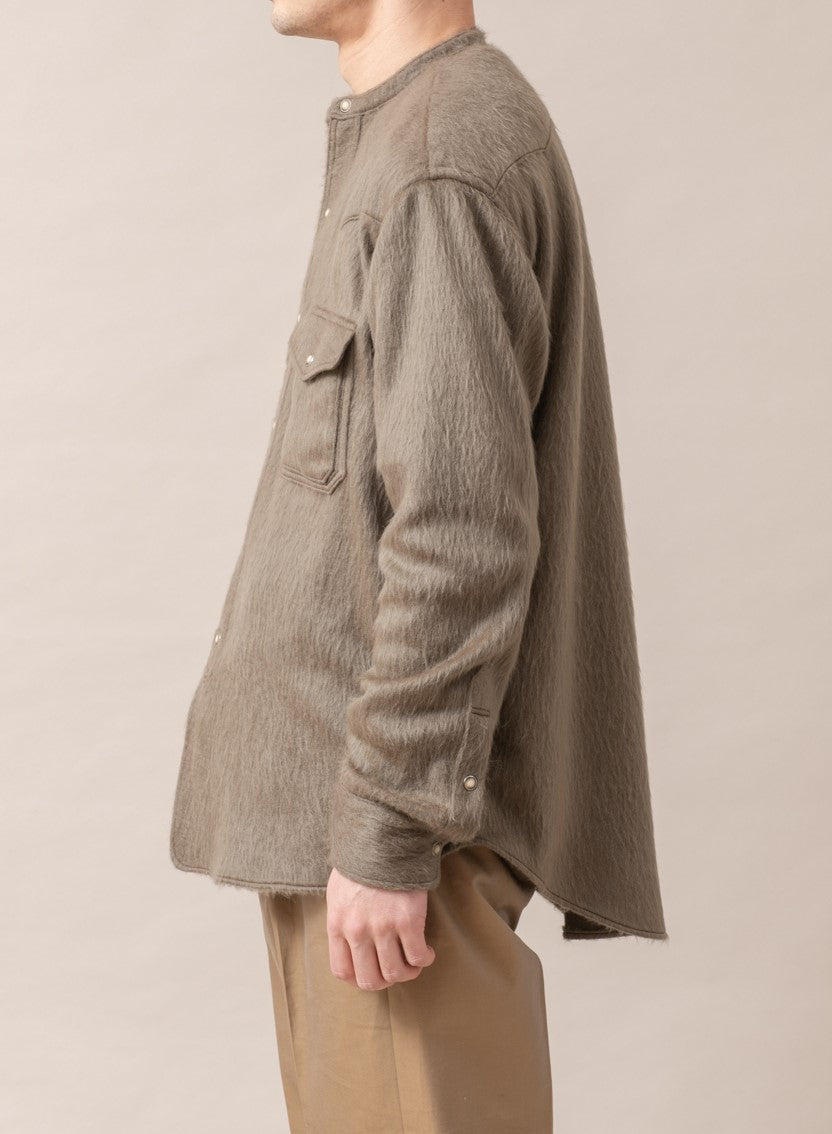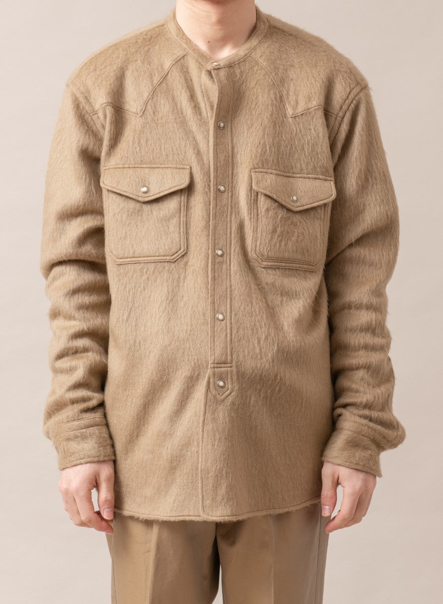 襟はバンドカラーにアレンジしたウエスタンディティールのオーバーシャツはザックリとしたシルエットでシャツジャケットとして羽織ってもらいたい。