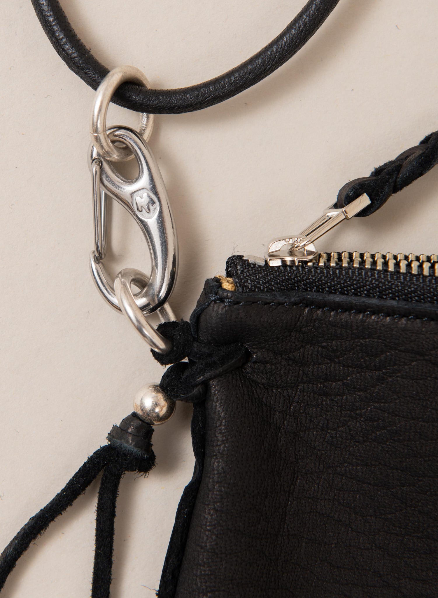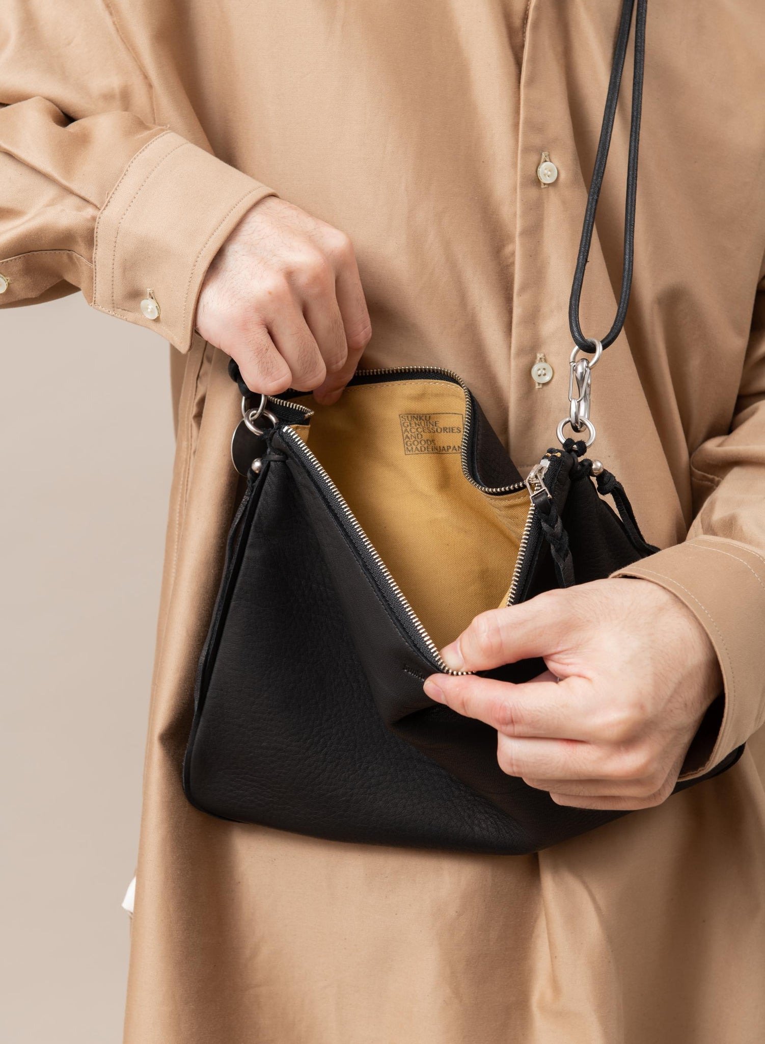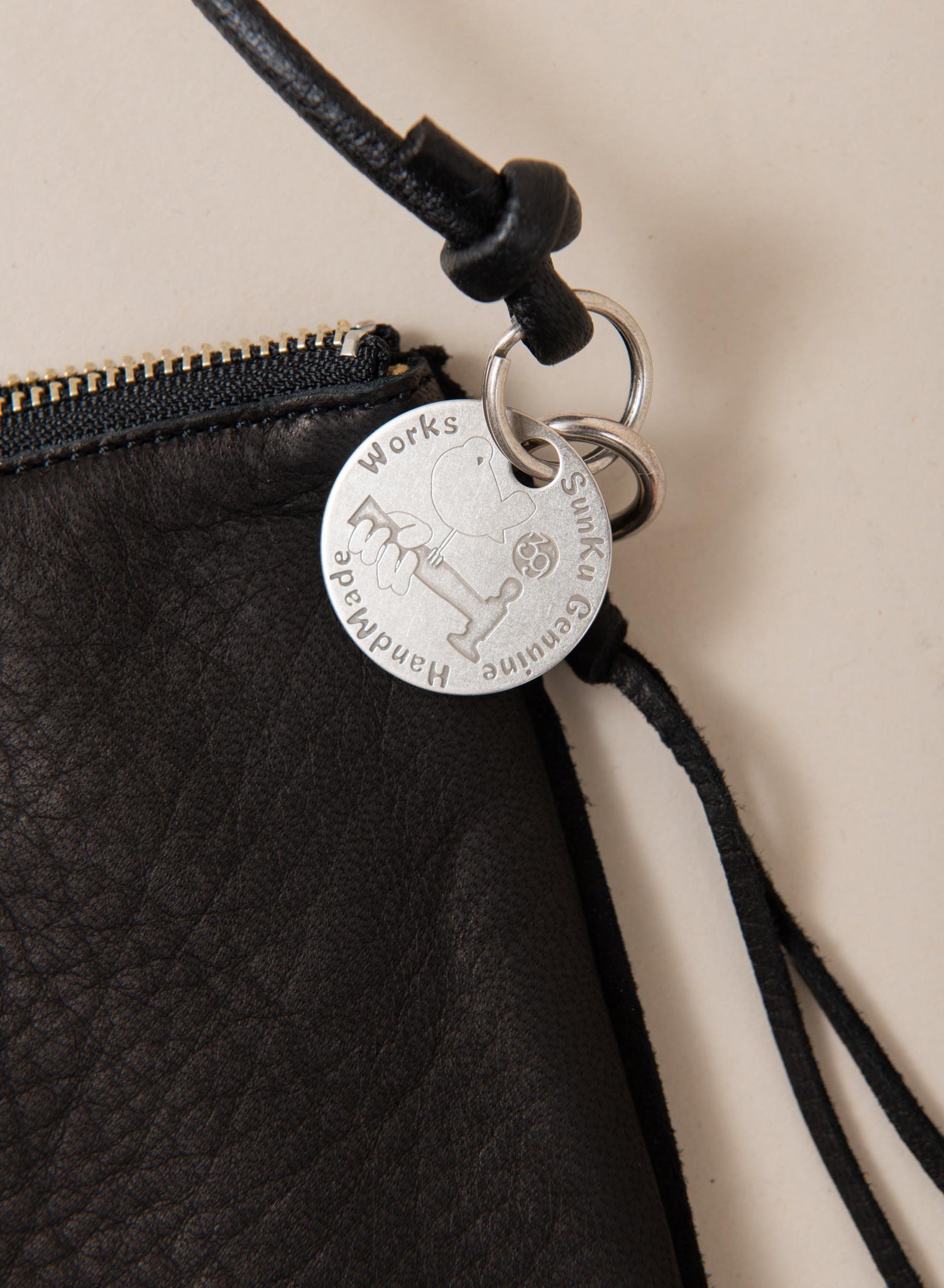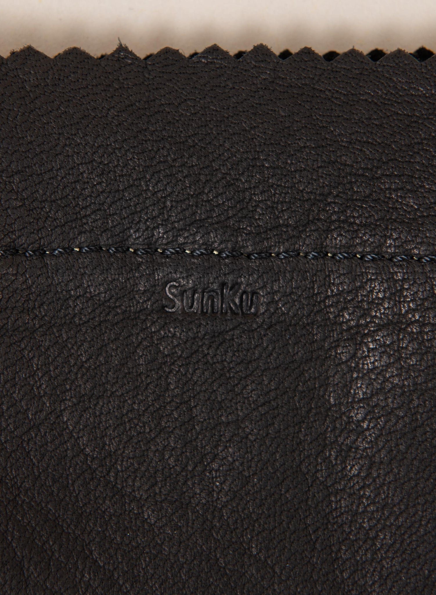 Sunkuのアイコニックなプレートと存在感あるフックがキラリと存在感有るサコッシュタイプのレザーバック。目を引くレザーストラップとオールドビーズはインディアンジュエリーそのもの。内側に SunKu の刻印。