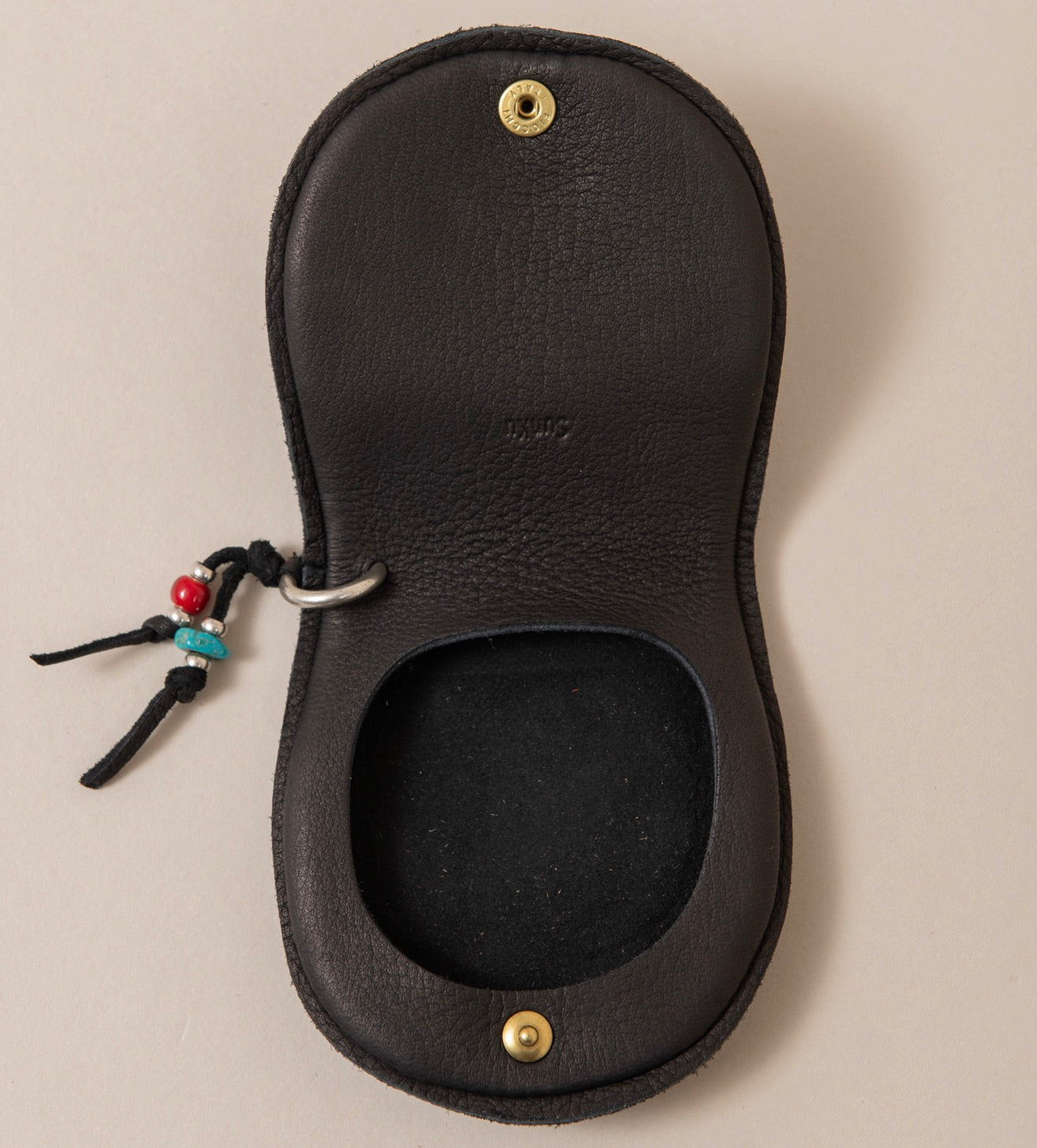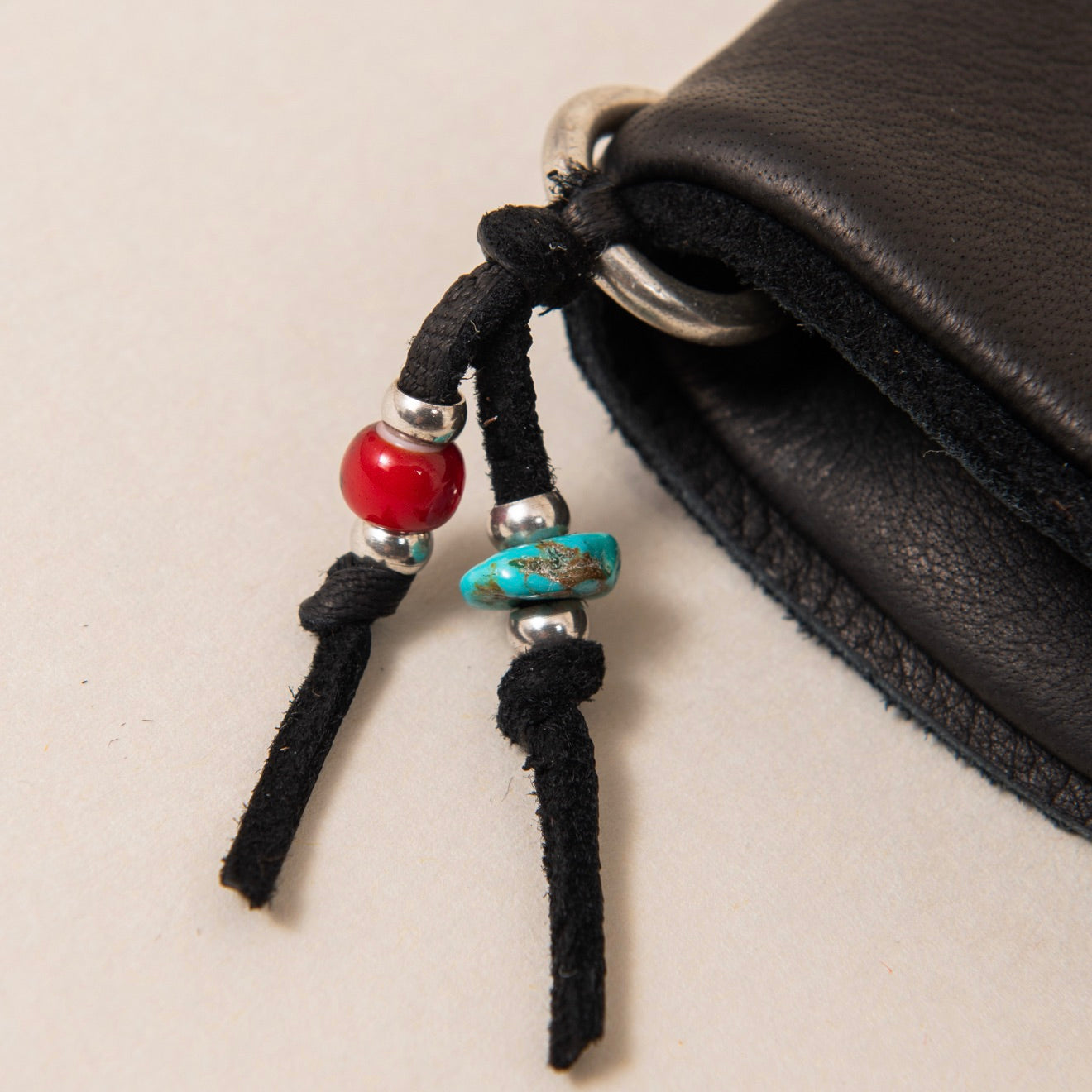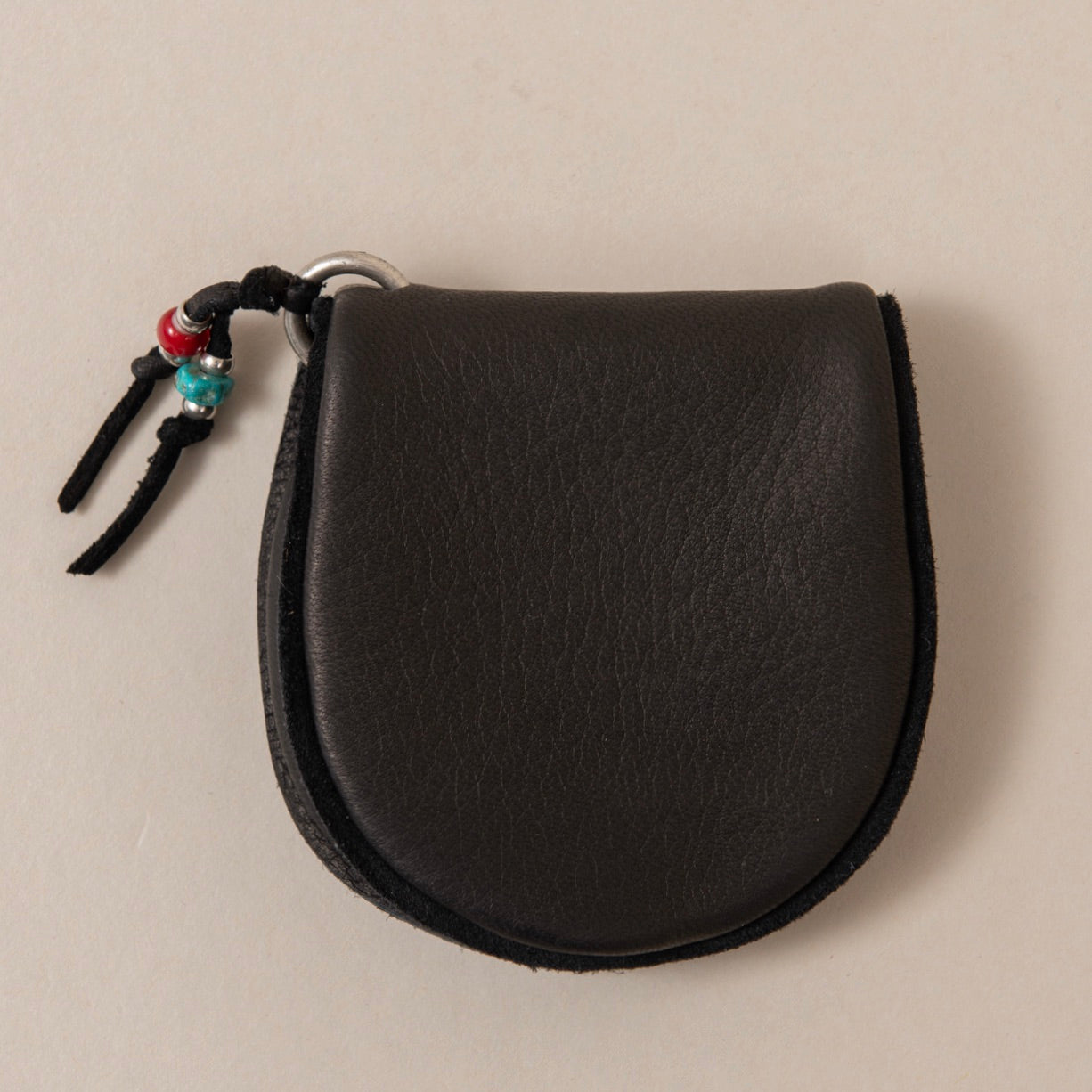 手のひらにちょうどよく馴染む小ぶりなコインケース。目を引くレザーストラップとオールドビーズはインディアンジュエリーそのもの。内側に SunKu の刻印。