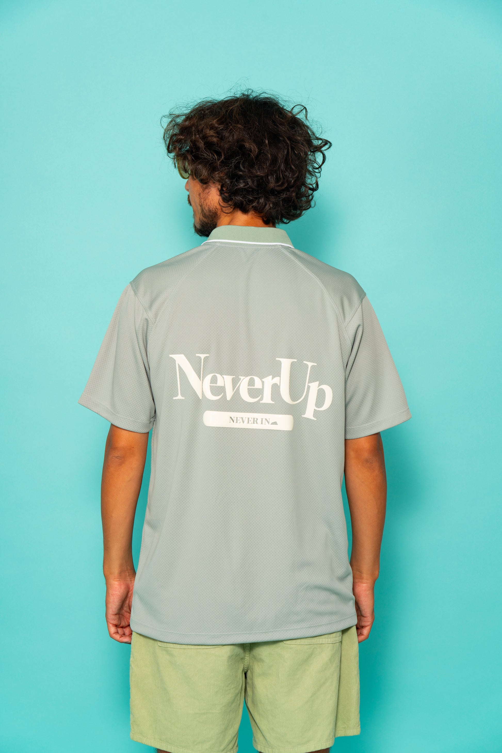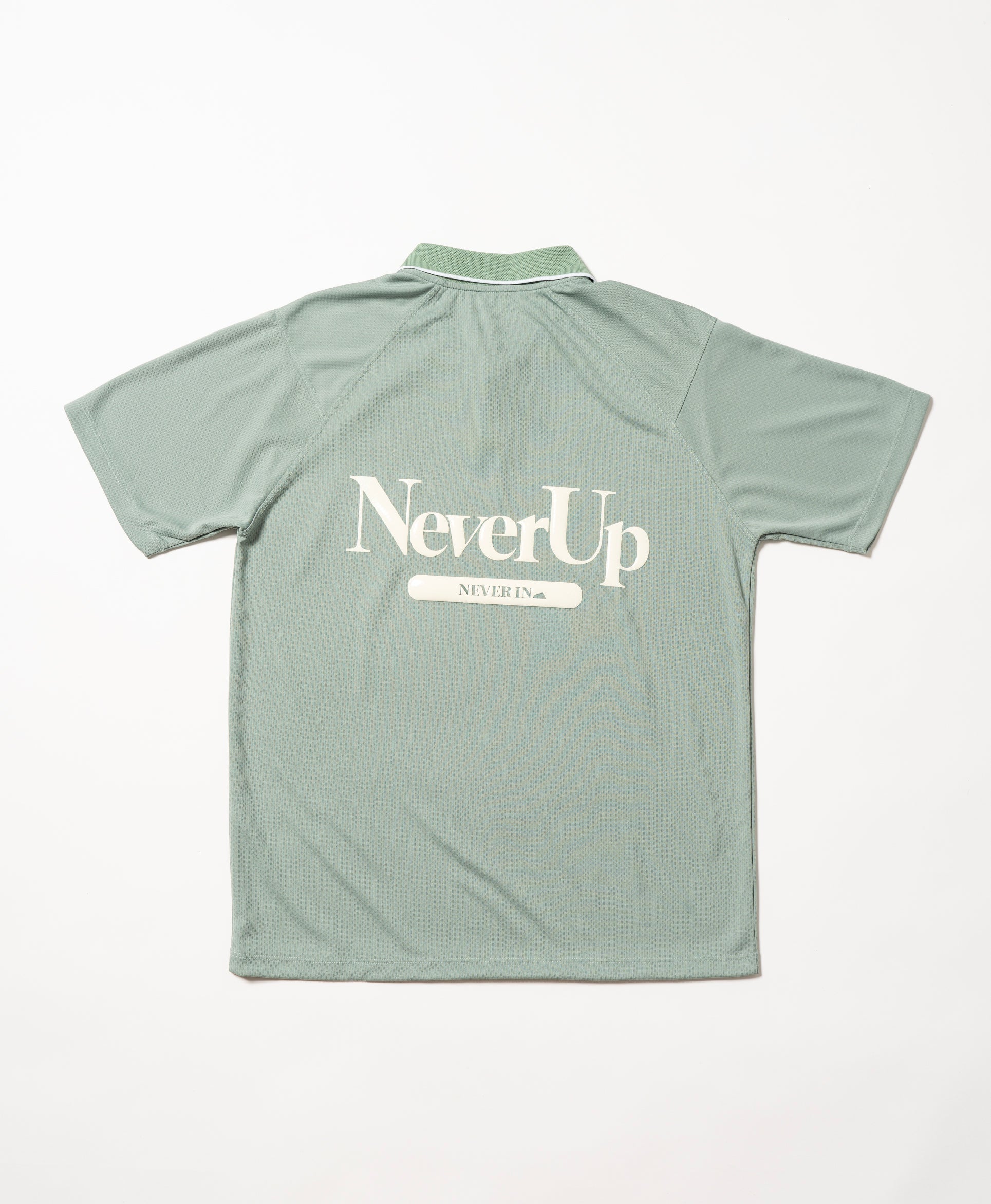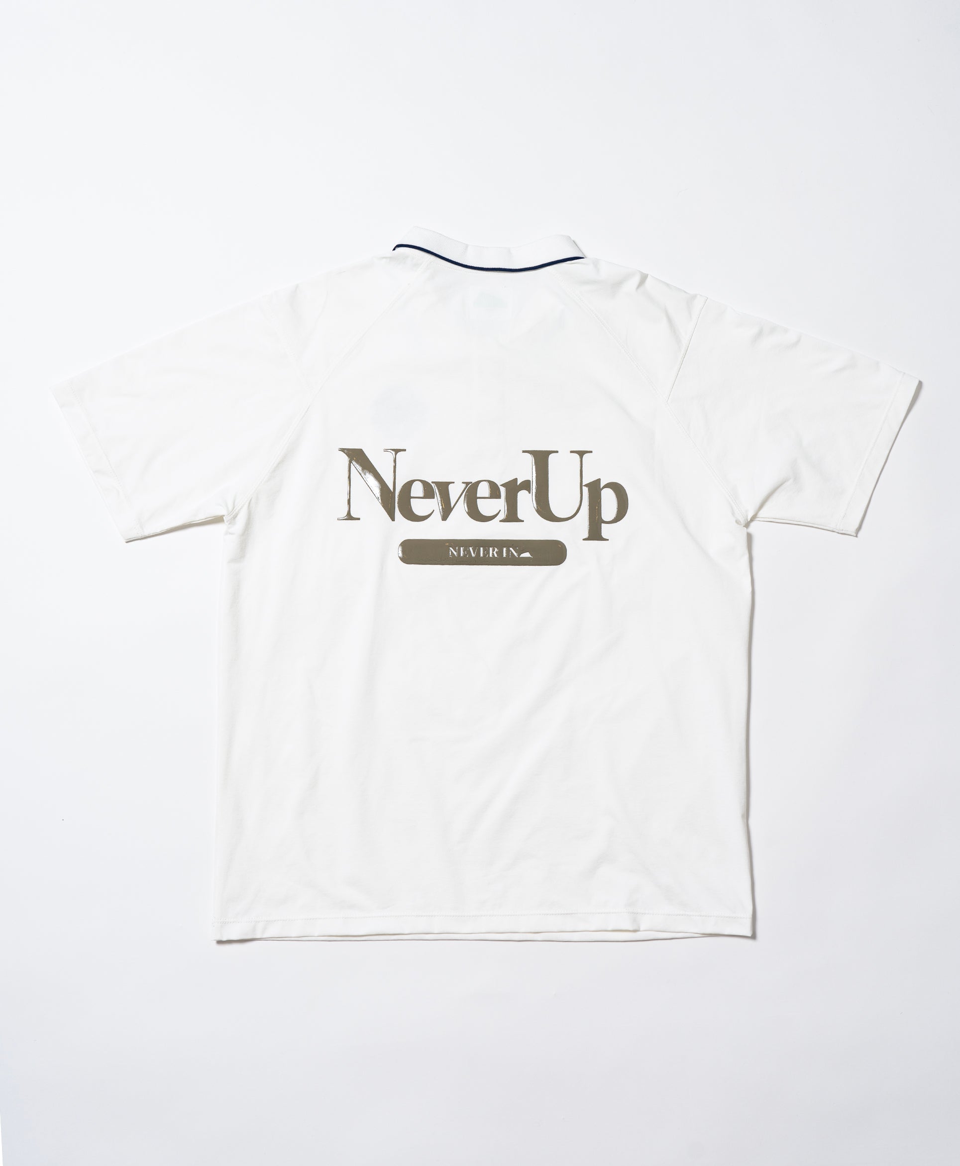 背面には大きくNever Up Never In/届かなければ入らない のメッセージをシリコンプリント。