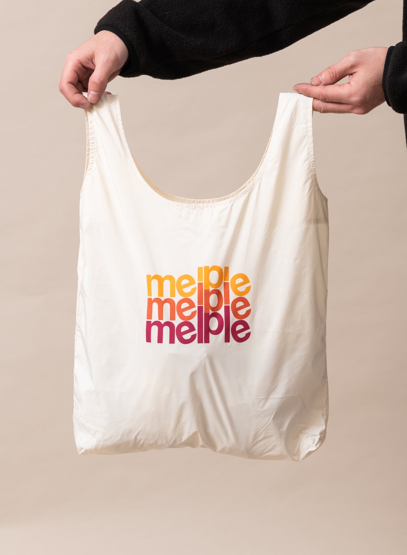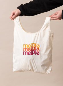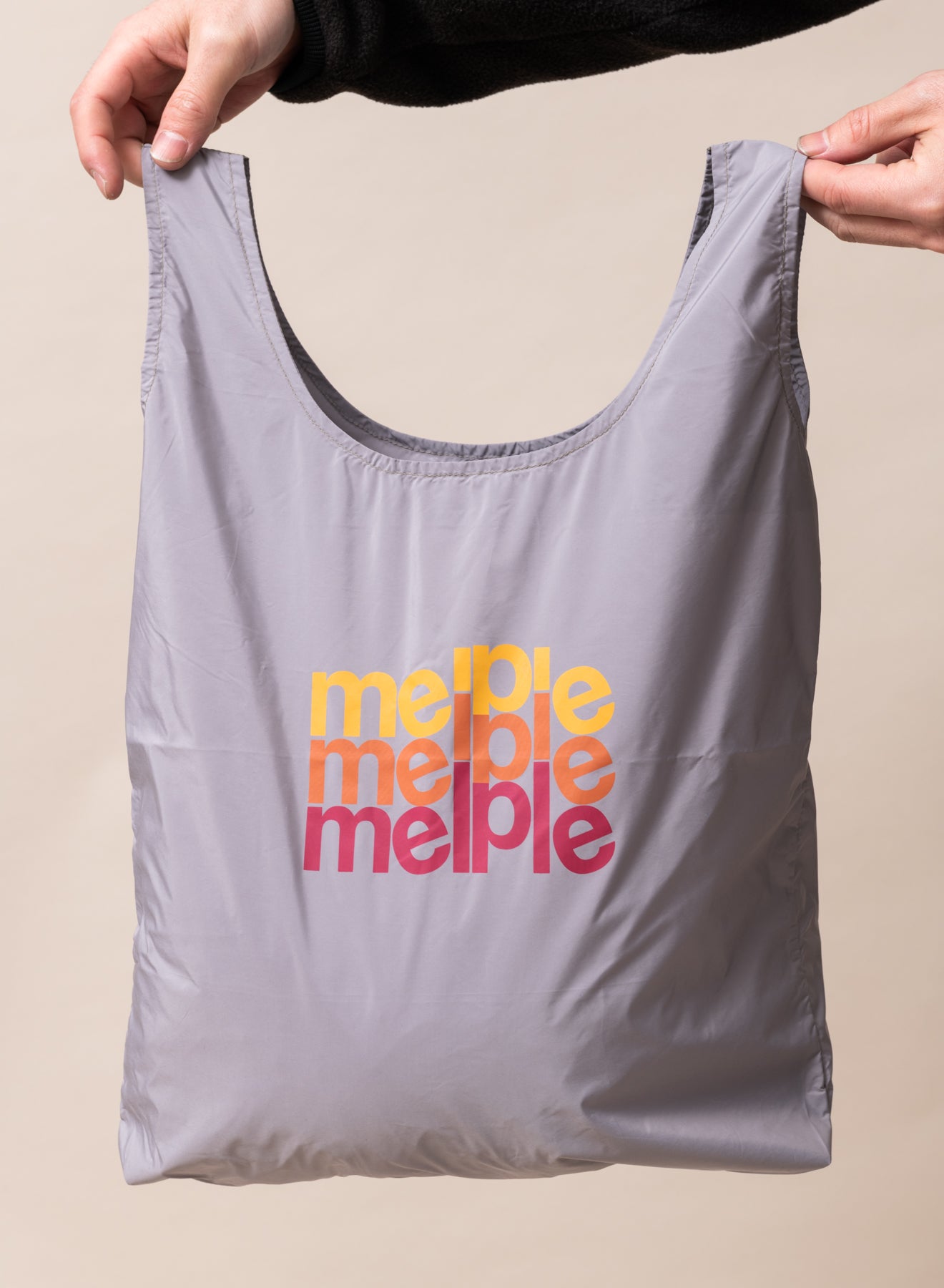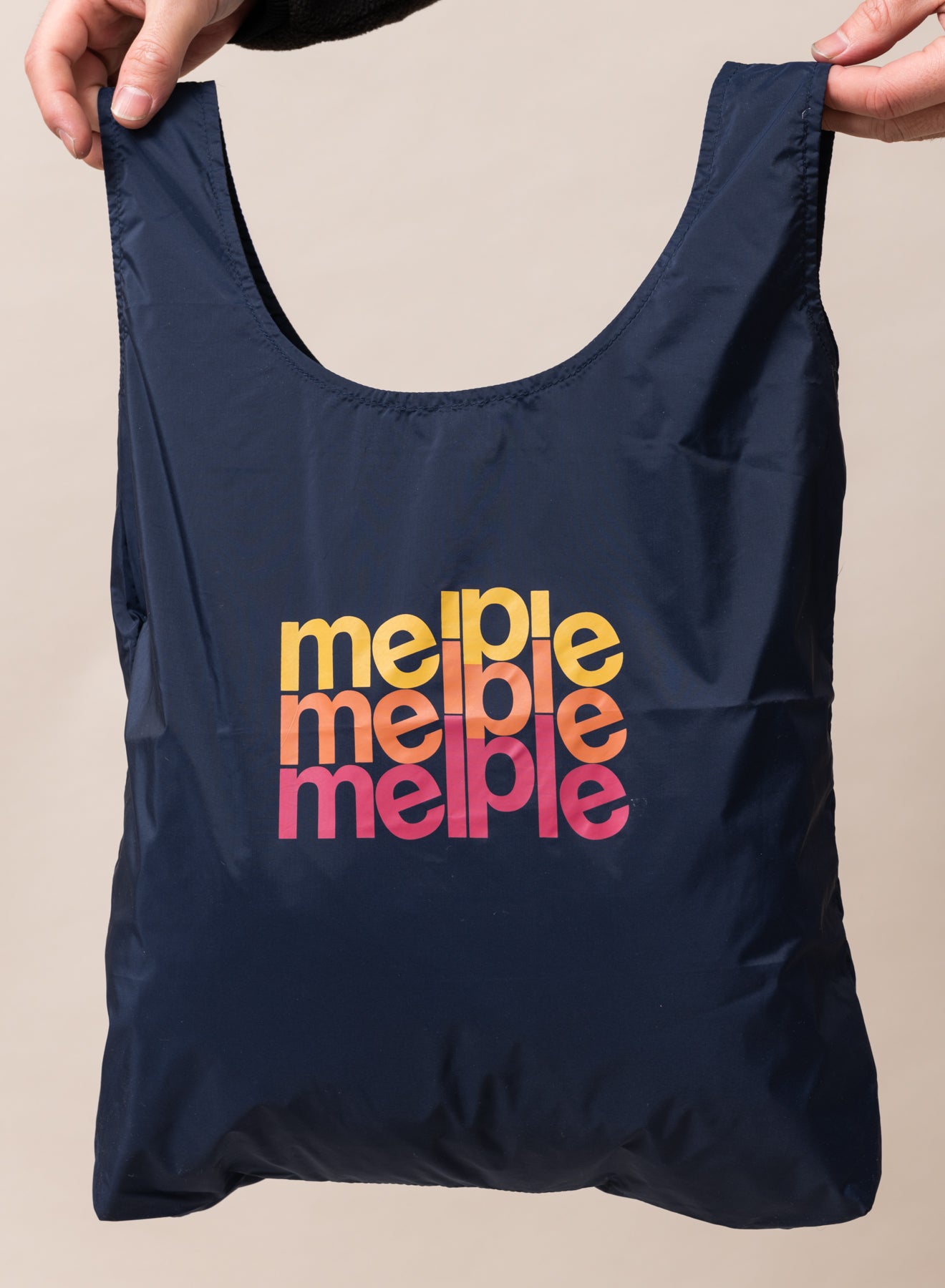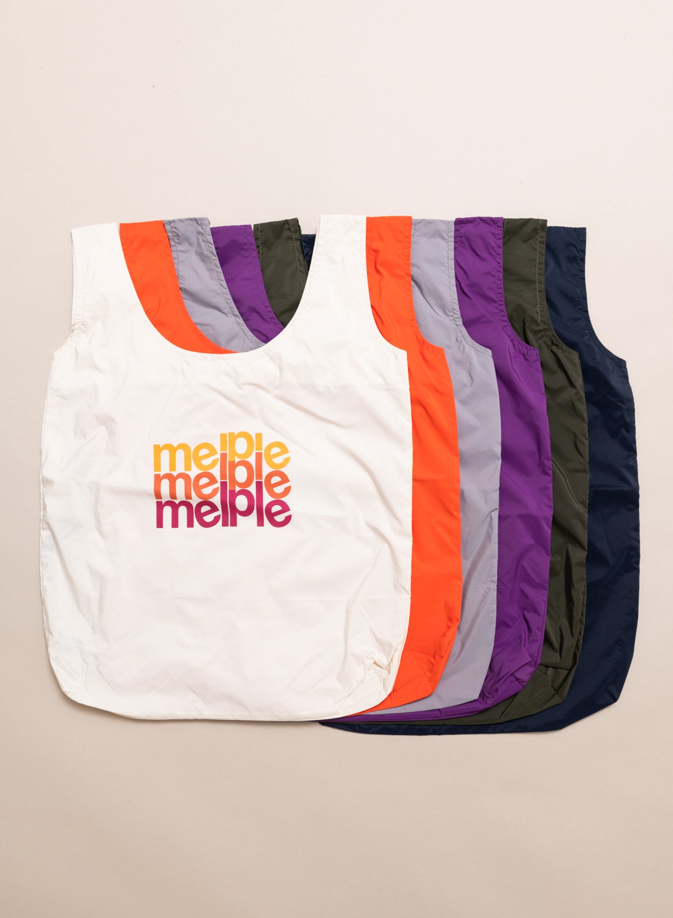 どのボディカラーにもバランス良いmelpleのカラーロゴ。のっぺりとした面構えのものが多いエコバッグだが、シンボルの3連ロゴで男女兼用できるデザイン。