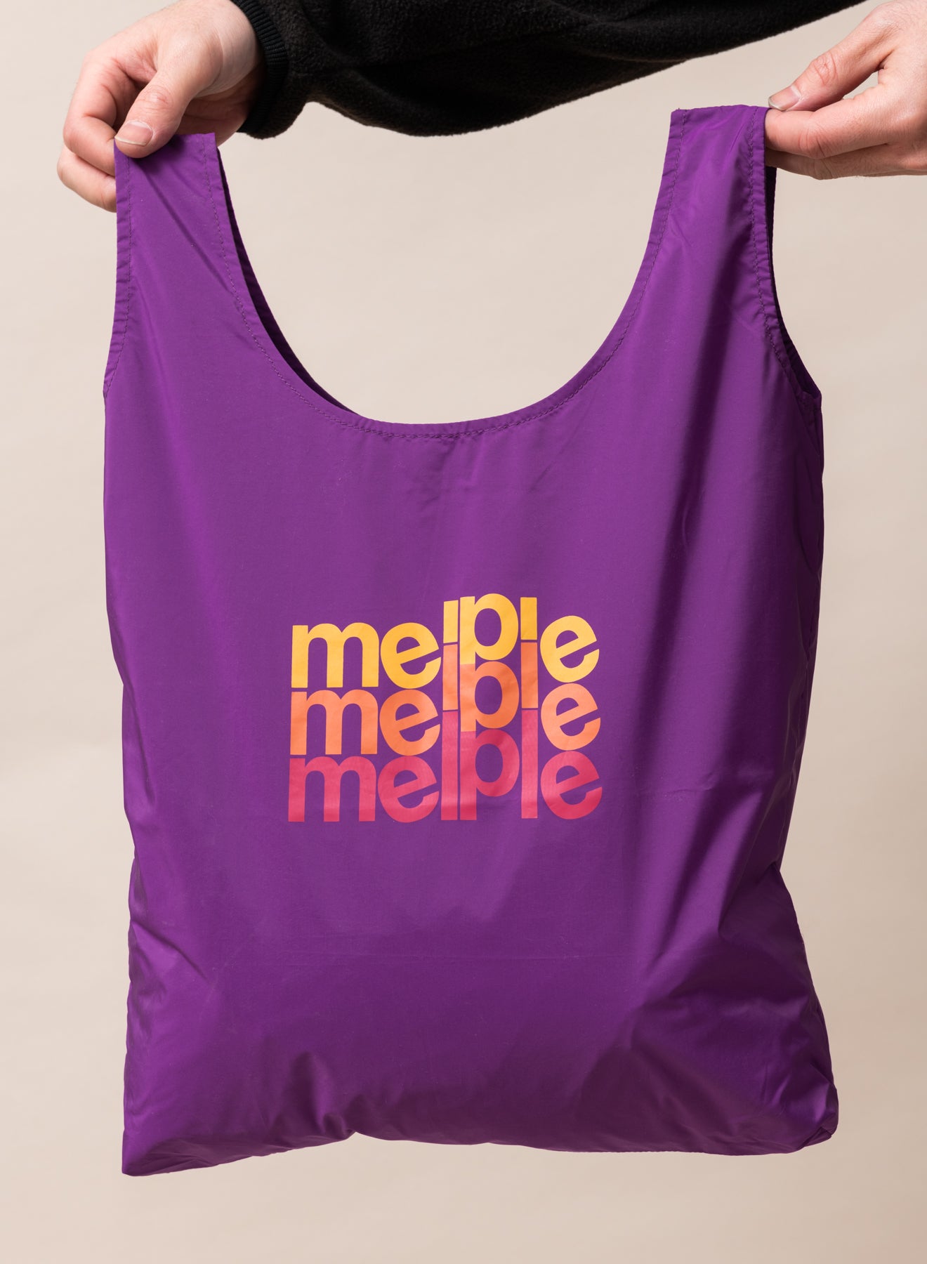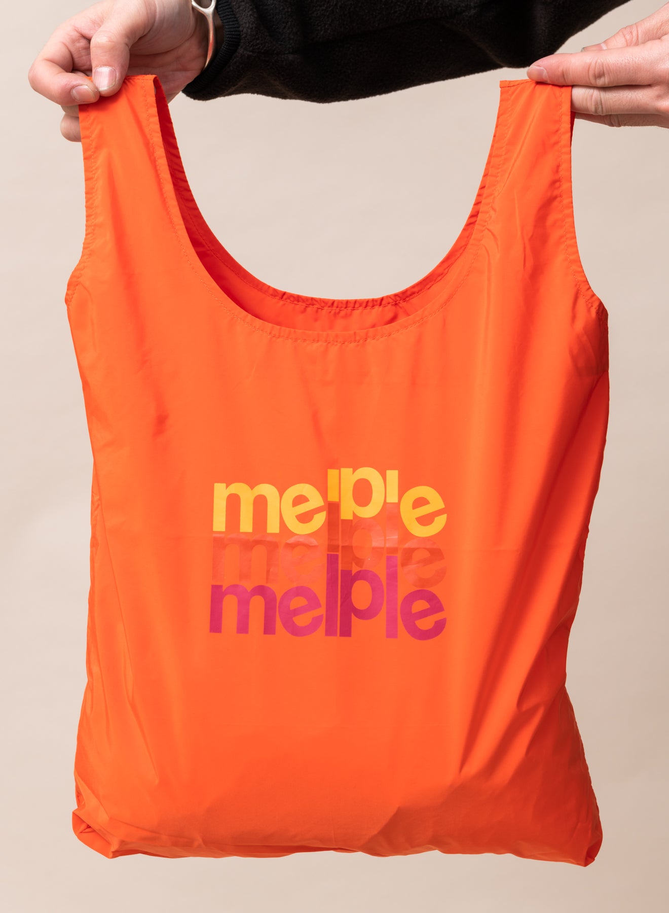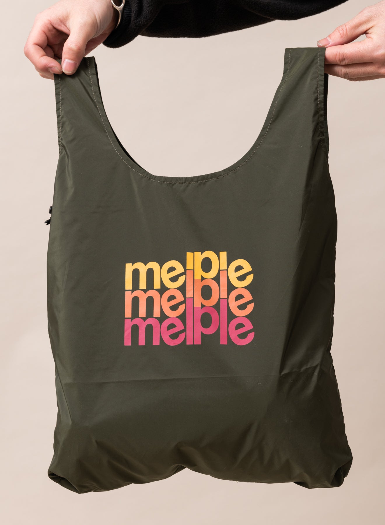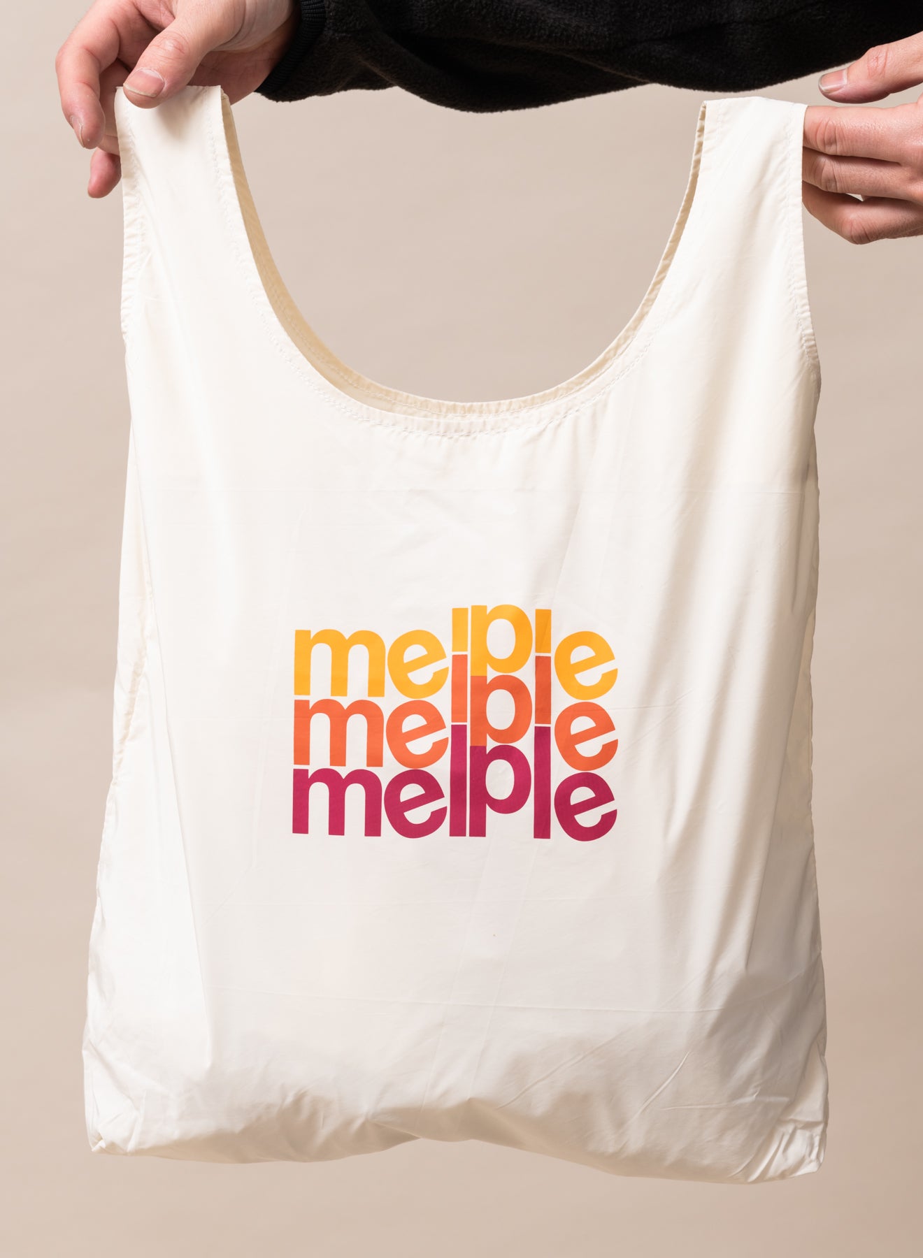 どのボディカラーにもバランス良いmelpleのカラーロゴ。のっぺりとした面構えのものが多いエコバッグだが、シンボルの3連ロゴで男女兼用できるデザイン。