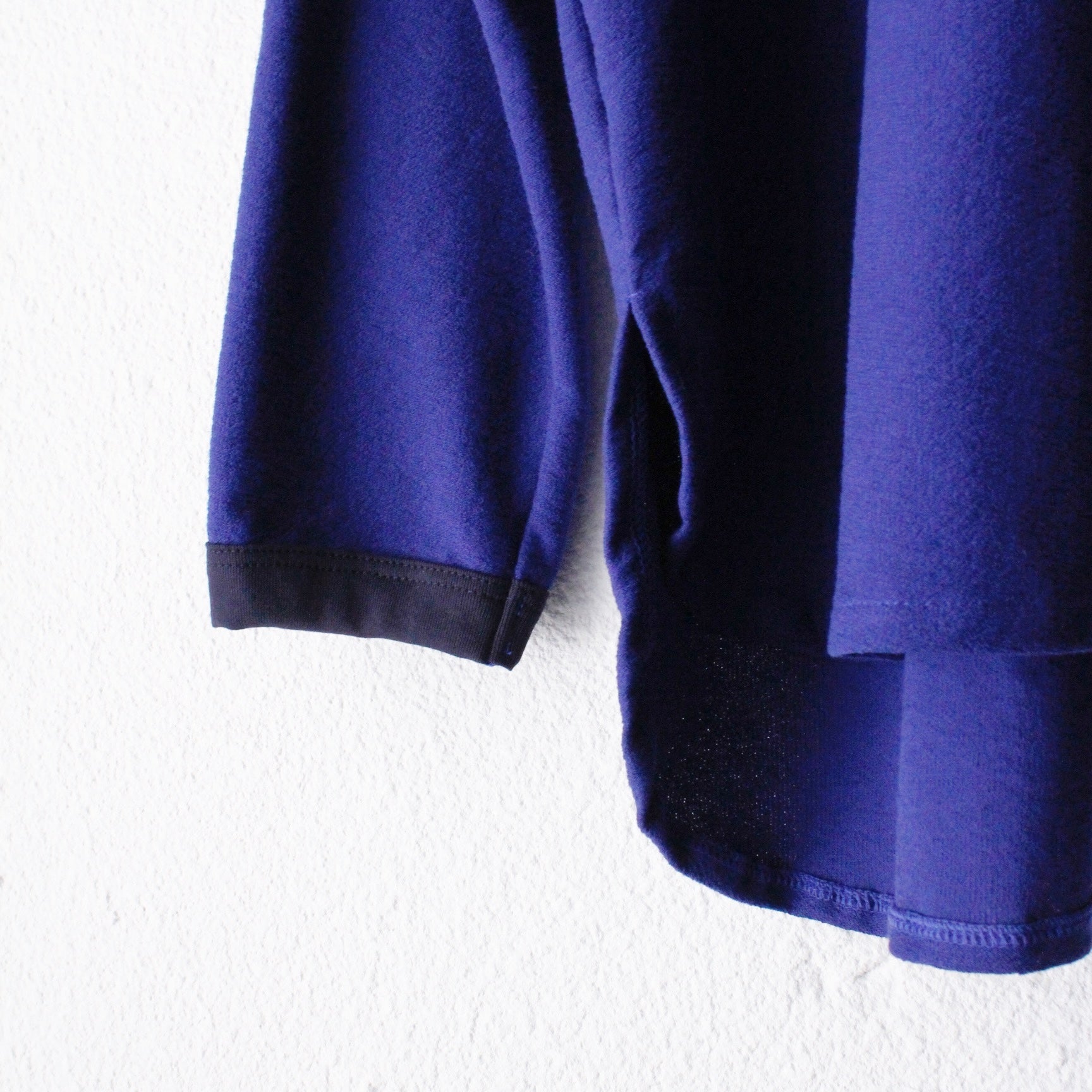 襟&袖口リンガー配色、深めに作ったスリット&ラウンドした裾も絶妙なバランスで1枚でも存在感を発揮する。