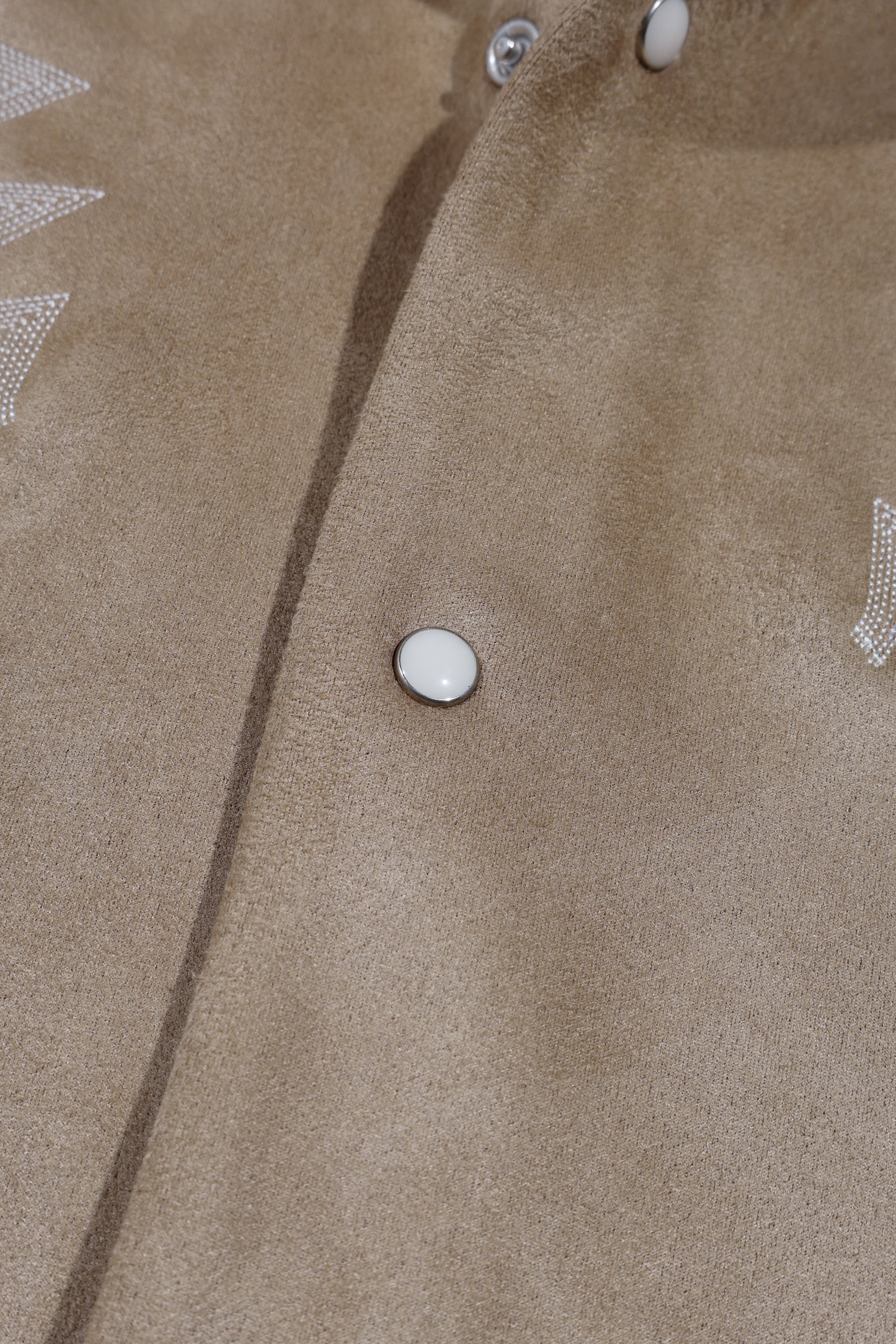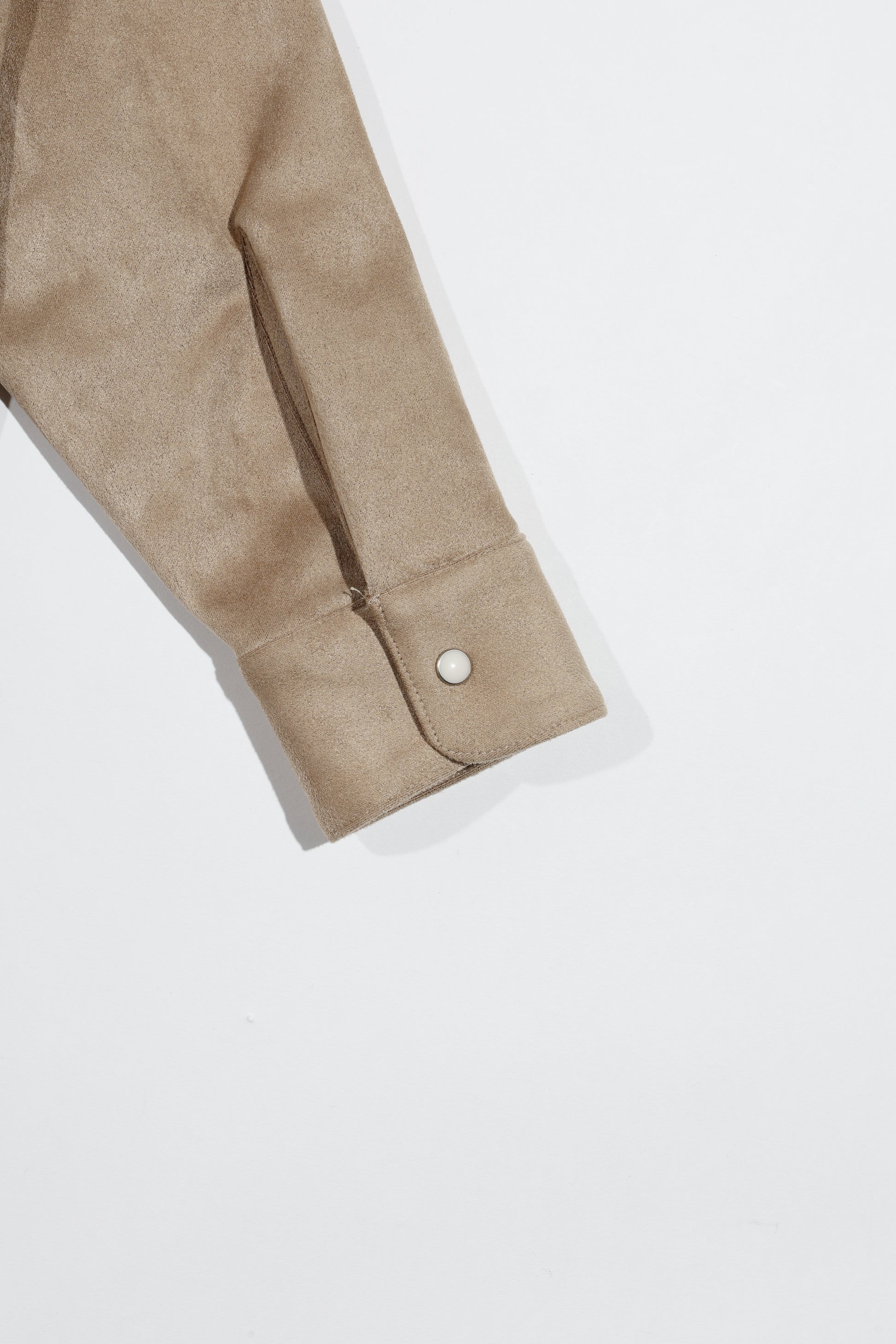 ゆったりとしたシルエットなので春先までライトアウター感覚でガバっと羽織れる1着は大人っぽい落ち着きのあるスウェード素材で仕上げました。