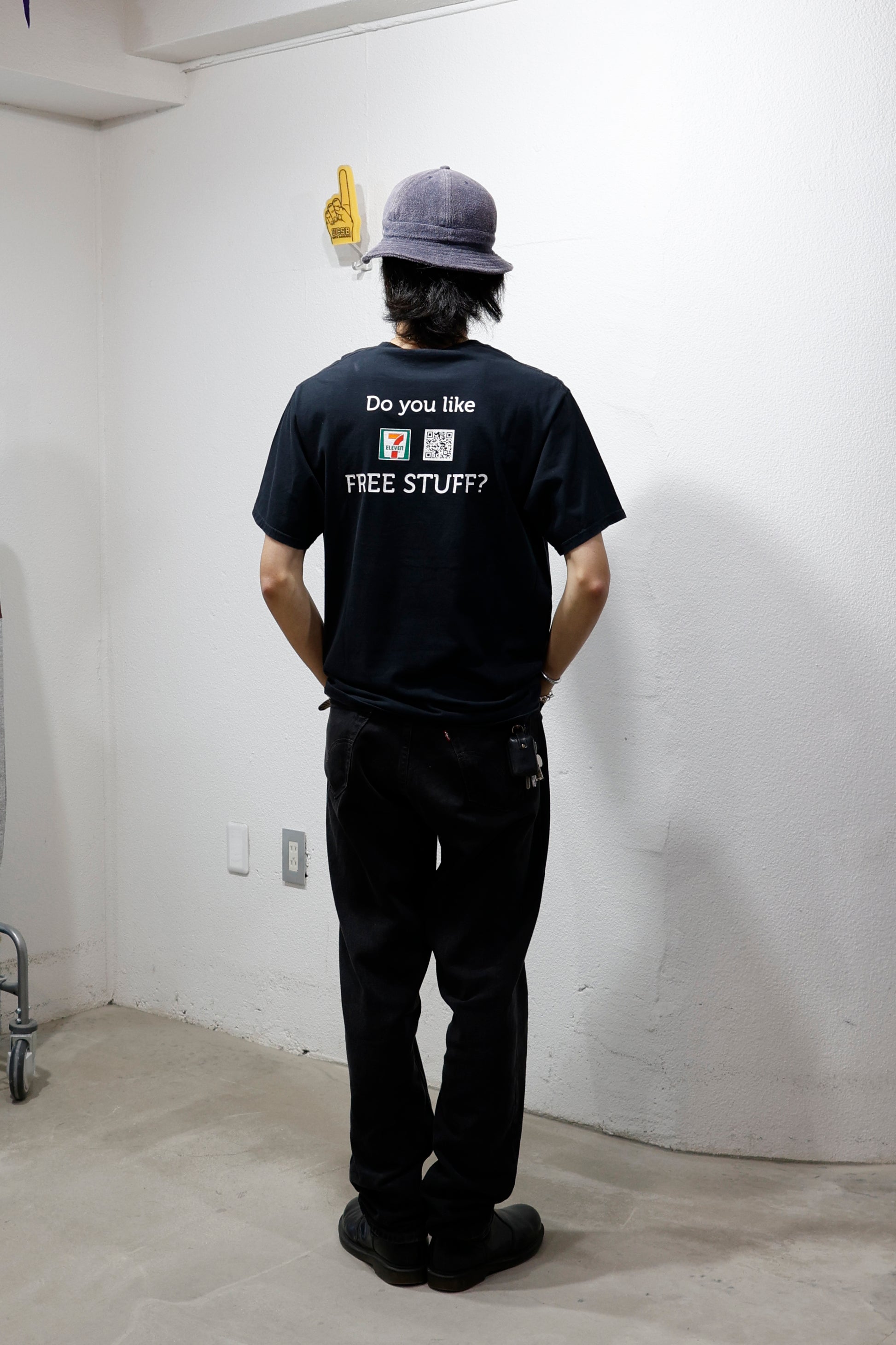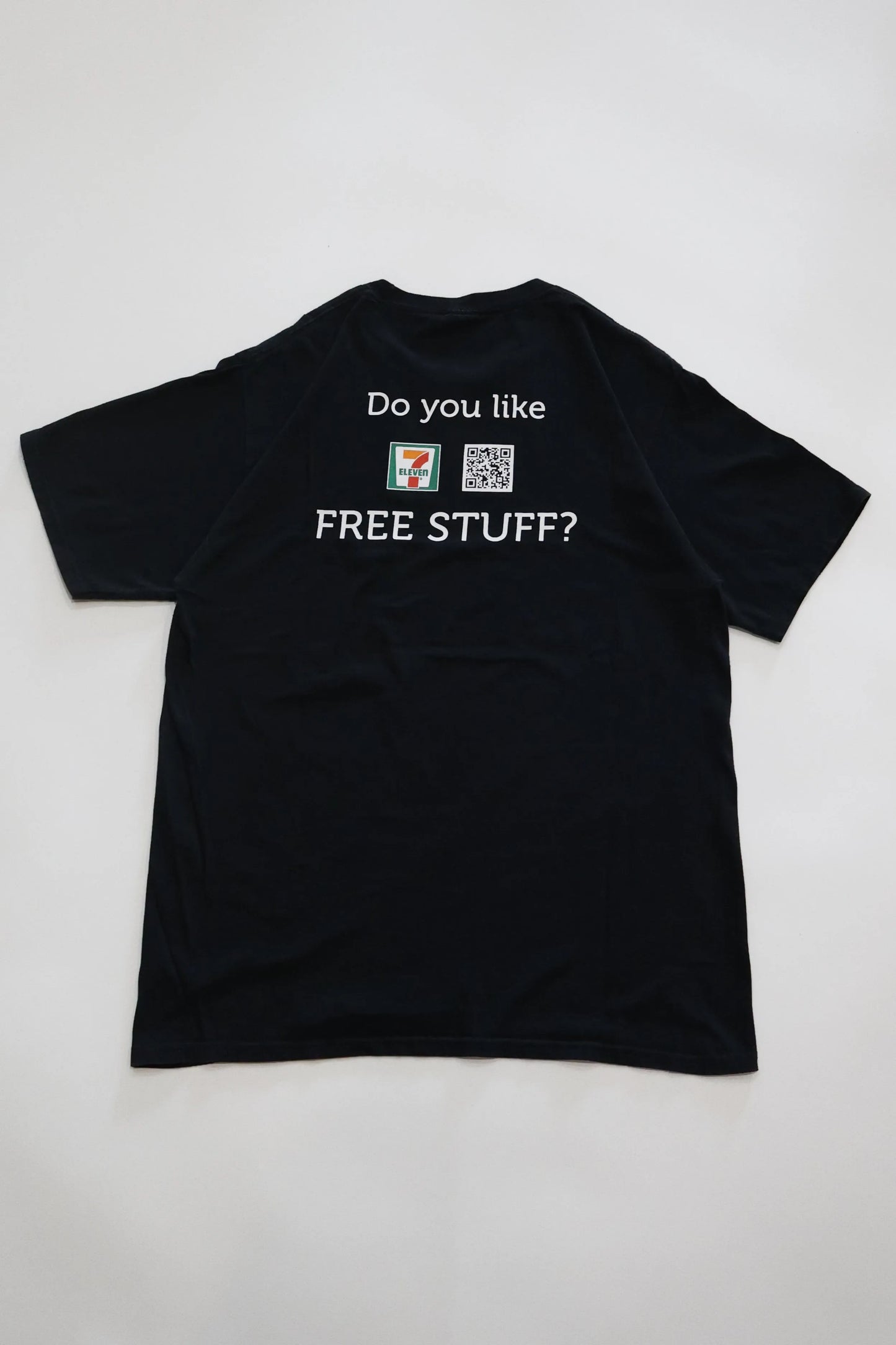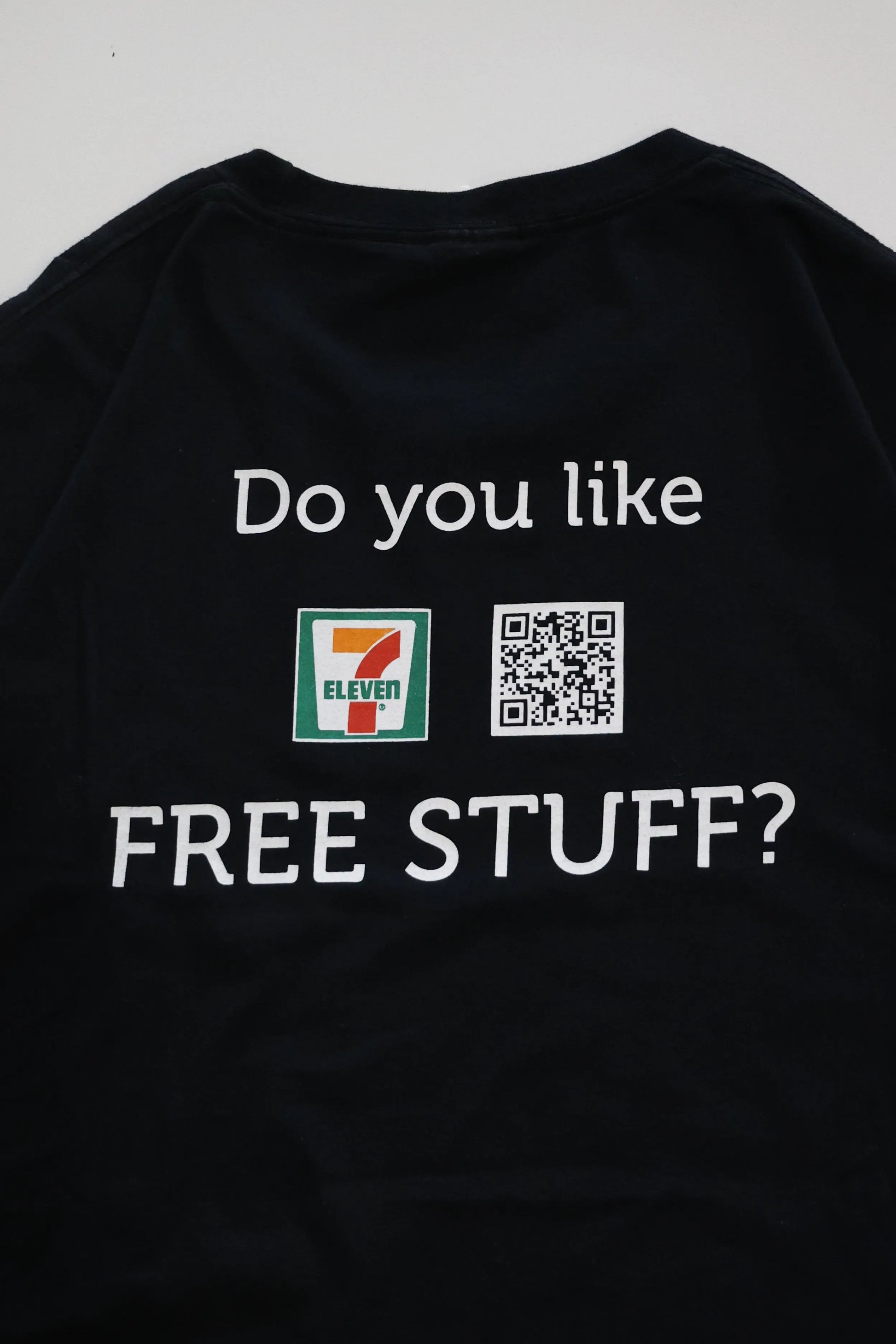 「Do you like FREE STUFF?」のメッセージとともに、7-ELEVENのロゴ&QRコードをプリント。ちょっぴりユーモアの効いた、街で視線を集めるデザインです。