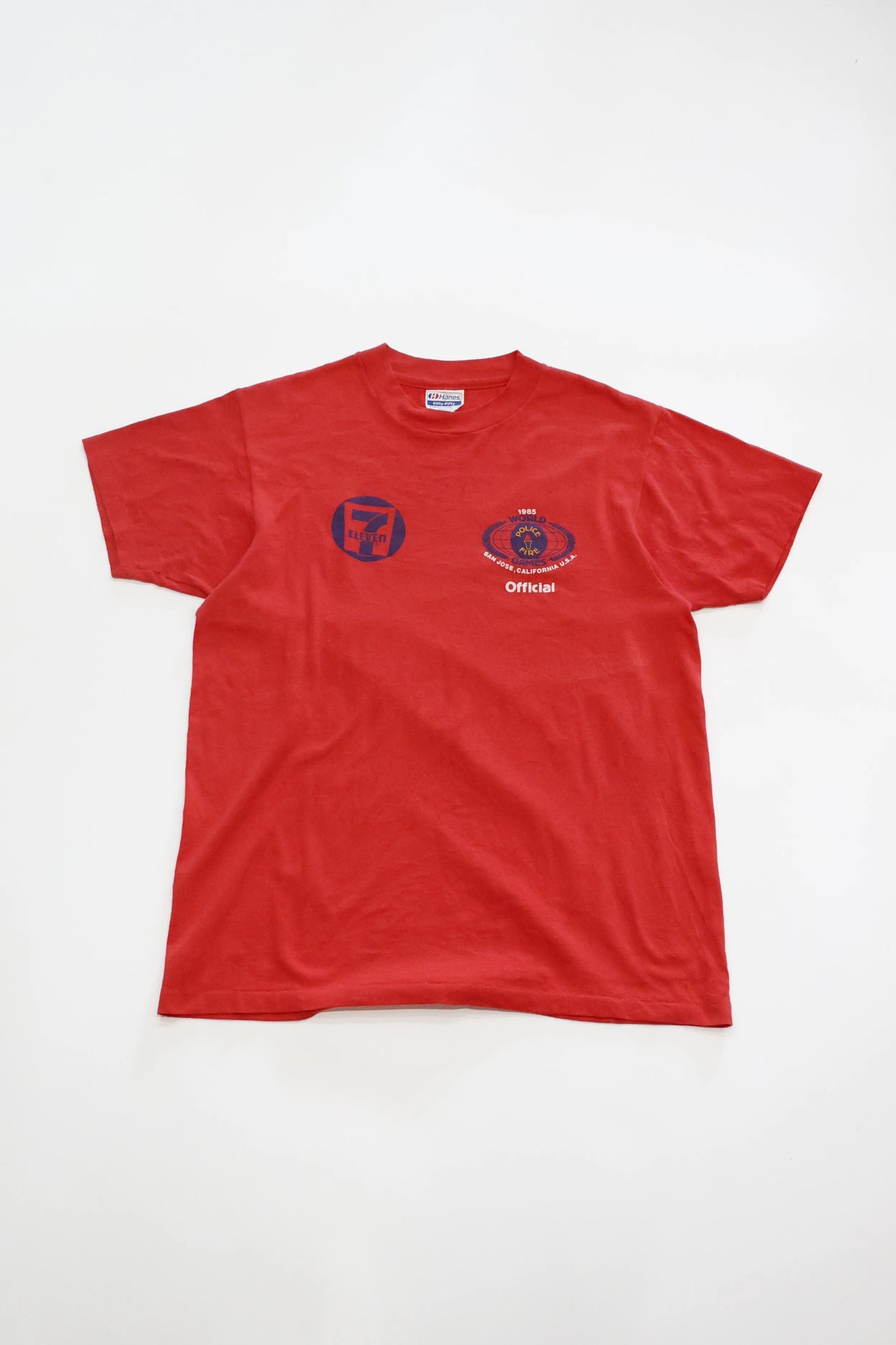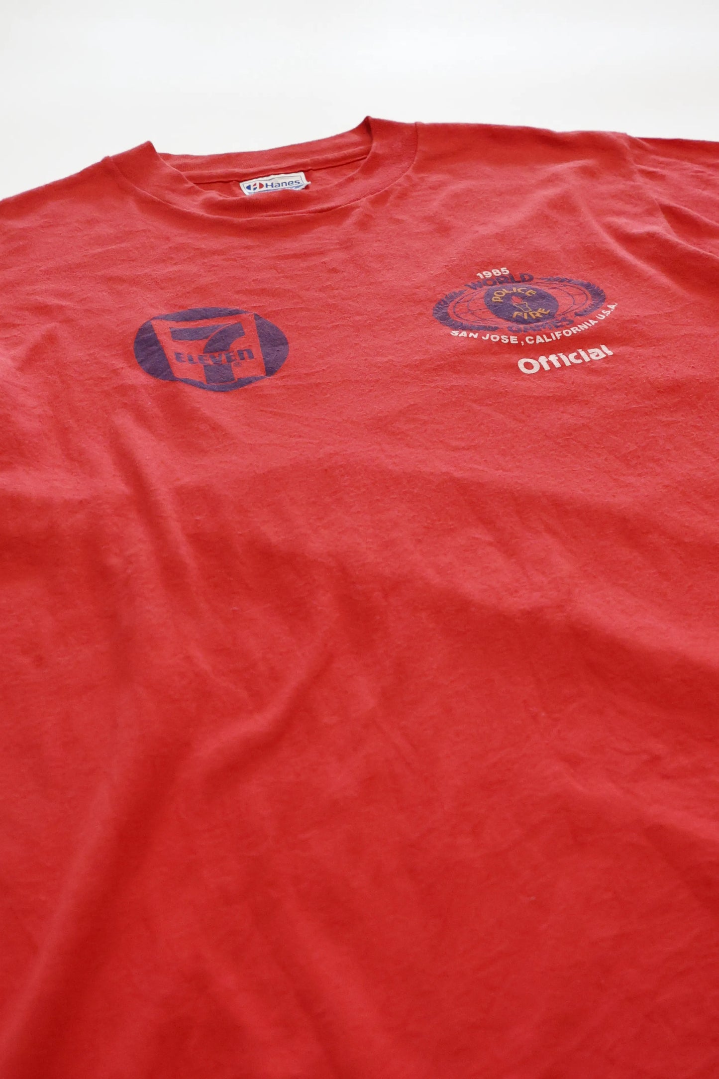 左胸には大会ロゴ(地球モチーフと月桂冠)と「POLICE」「FIRE」の文字、右胸にはスポンサーとして名を連ねた「7-ELEVEN」の当時のロゴがプリントされ、企業・大会・年代の文脈が交差する非常にユニークなデザインです。