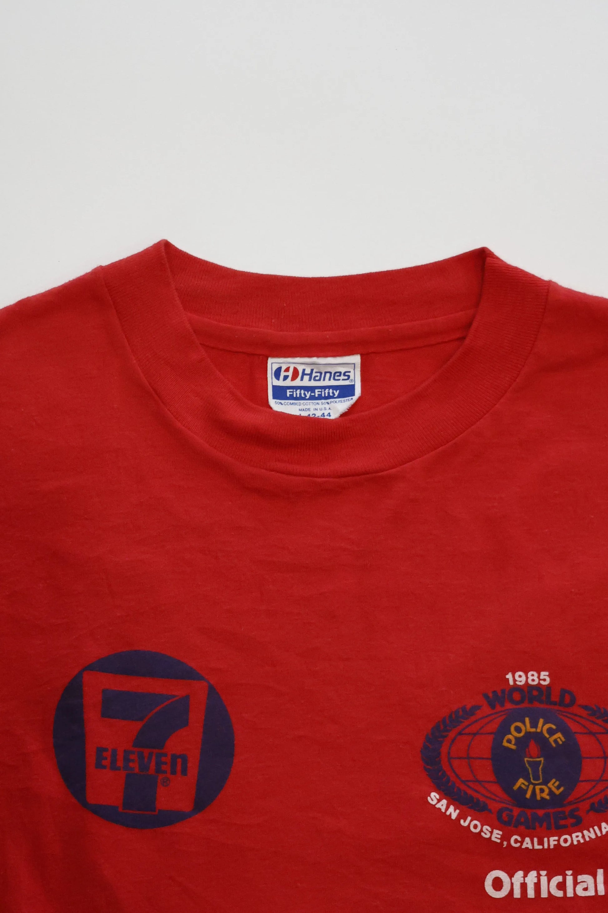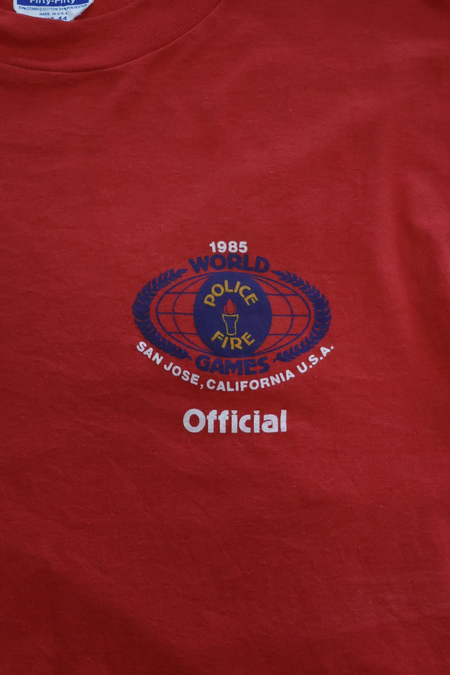 カリフォルニア州サンノゼで1985年に開催された「WORLD POLICE & FIRE GAMES(世界警察消防競技大会)」の大会スタッフ用オフィシャルTシャツ。