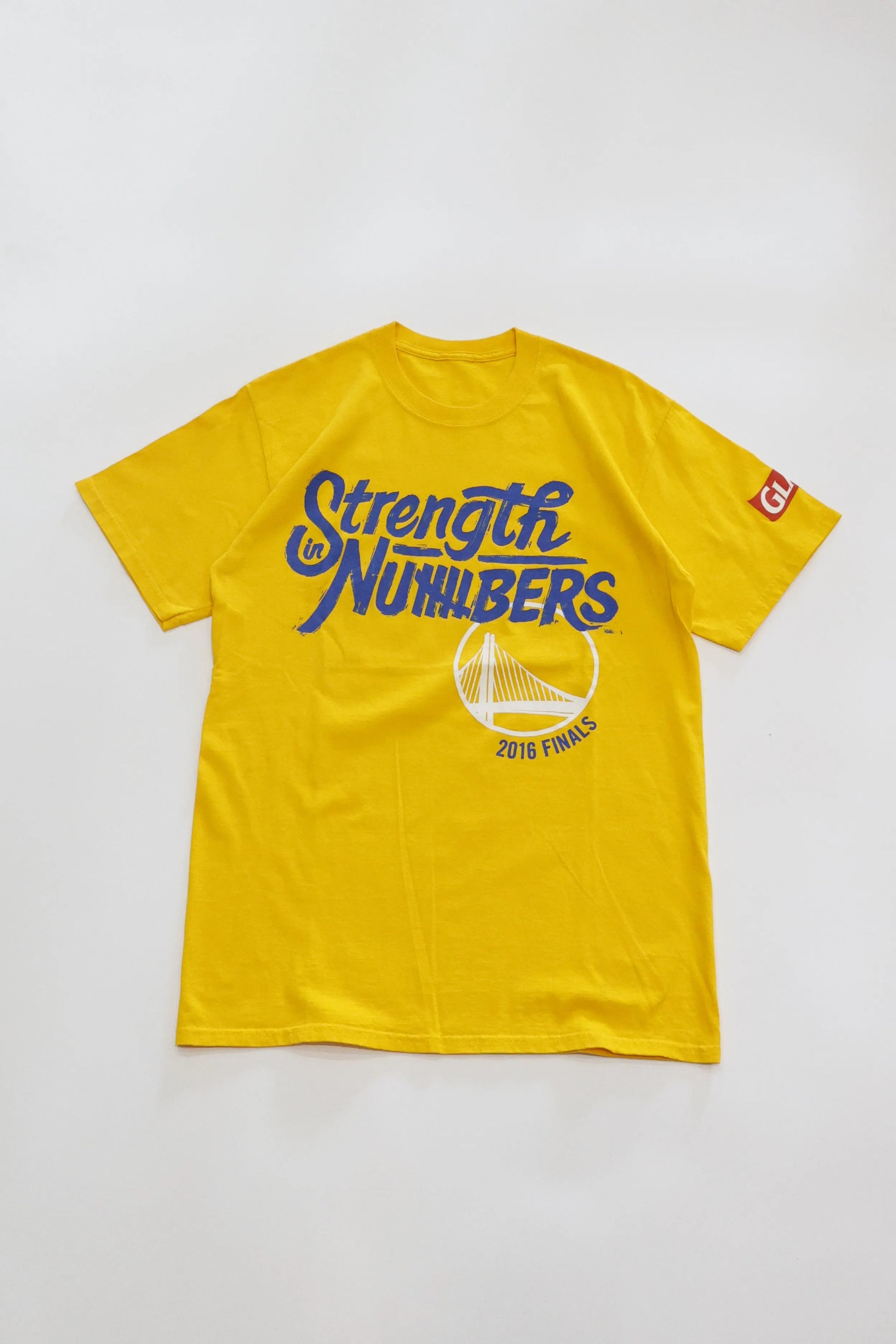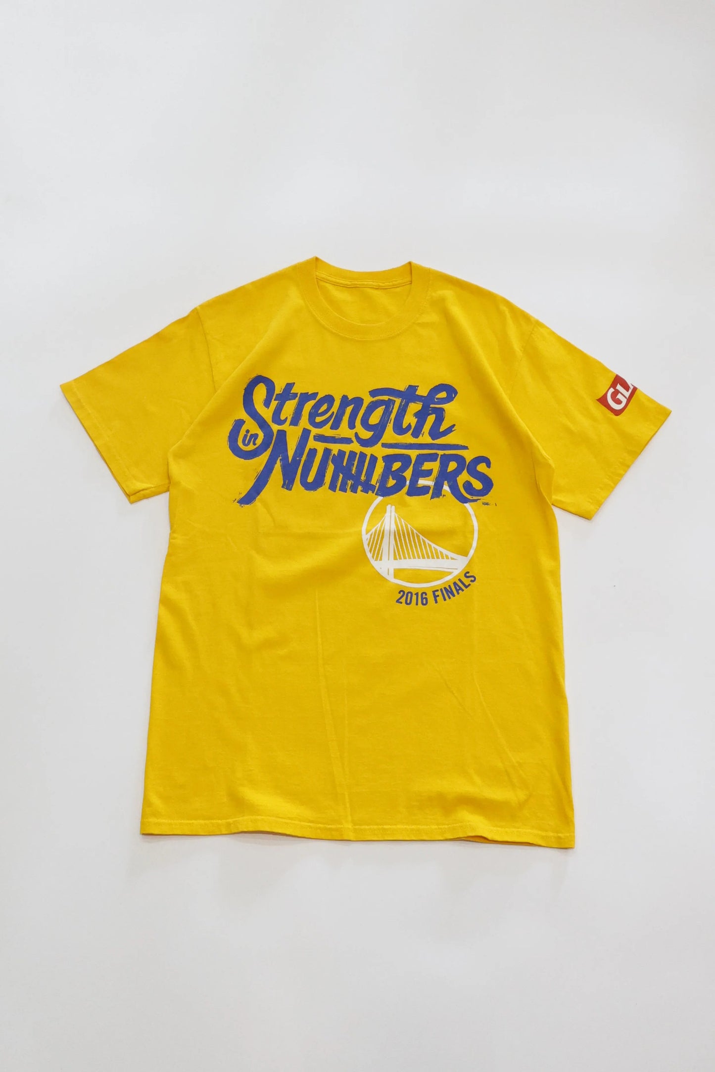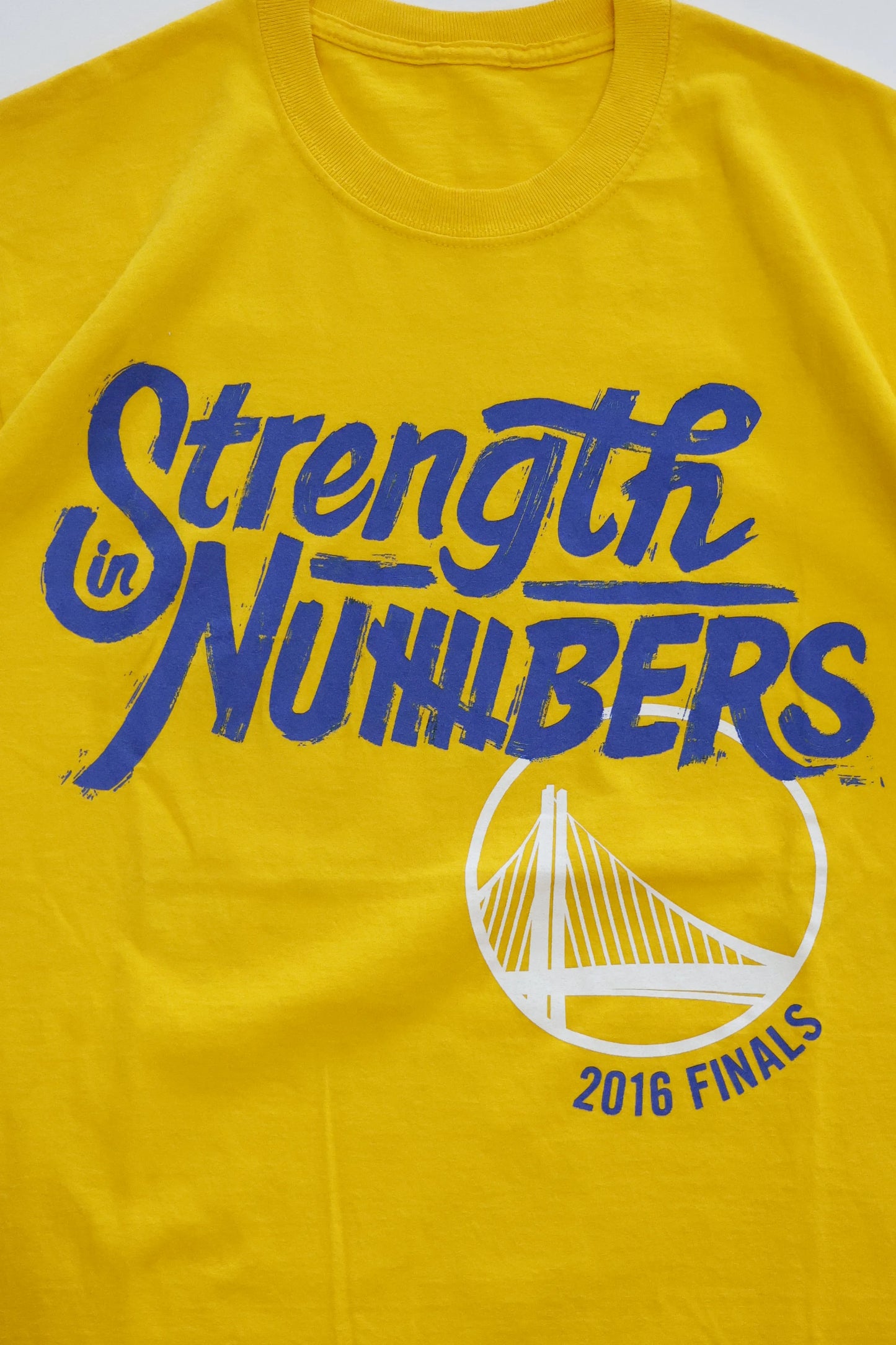 2015-16シーズンにNBA記録となる73勝を挙げ、ファイナル進出を果たしたゴールデンステート・ウォリアーズ。その年のチームスローガン「Strength in Numbers(団結は力なり)」を胸元に大胆にプリントした、2016 NBAファイナル公式Tシャツです。