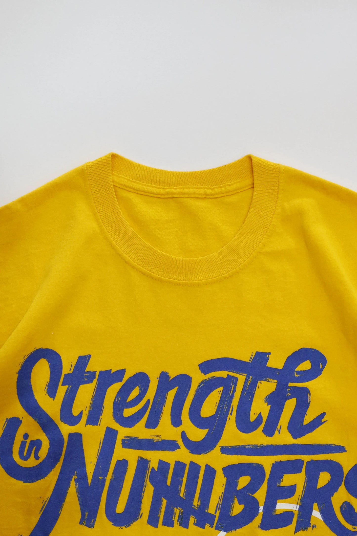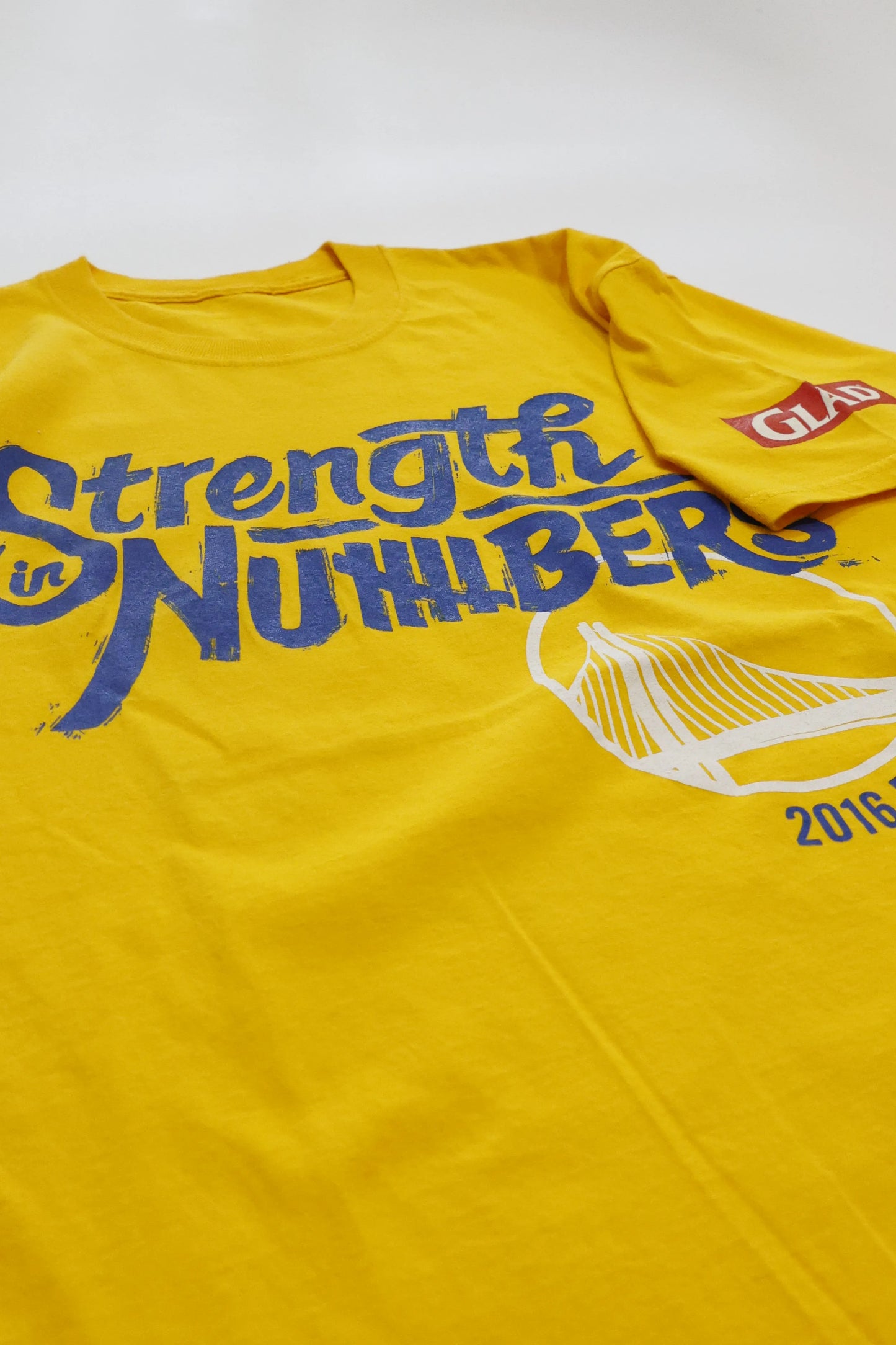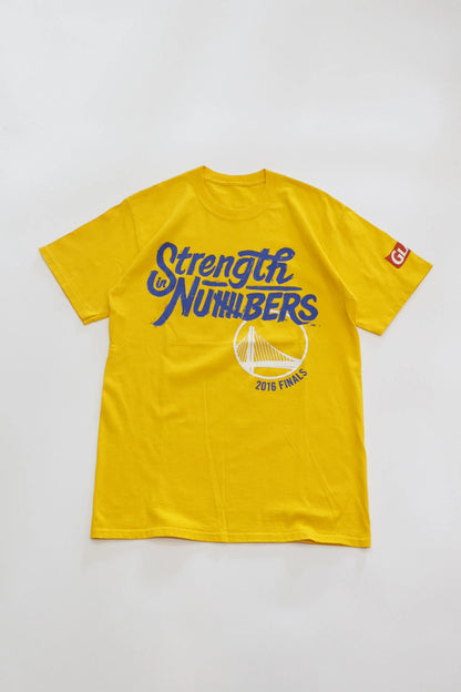 2015-16シーズンにNBA記録となる73勝を挙げ、ファイナル進出を果たしたゴールデンステート・ウォリアーズ。その年のチームスローガン「Strength in Numbers(団結は力なり)」を胸元に大胆にプリントした、2016 NBAファイナル公式Tシャツです。