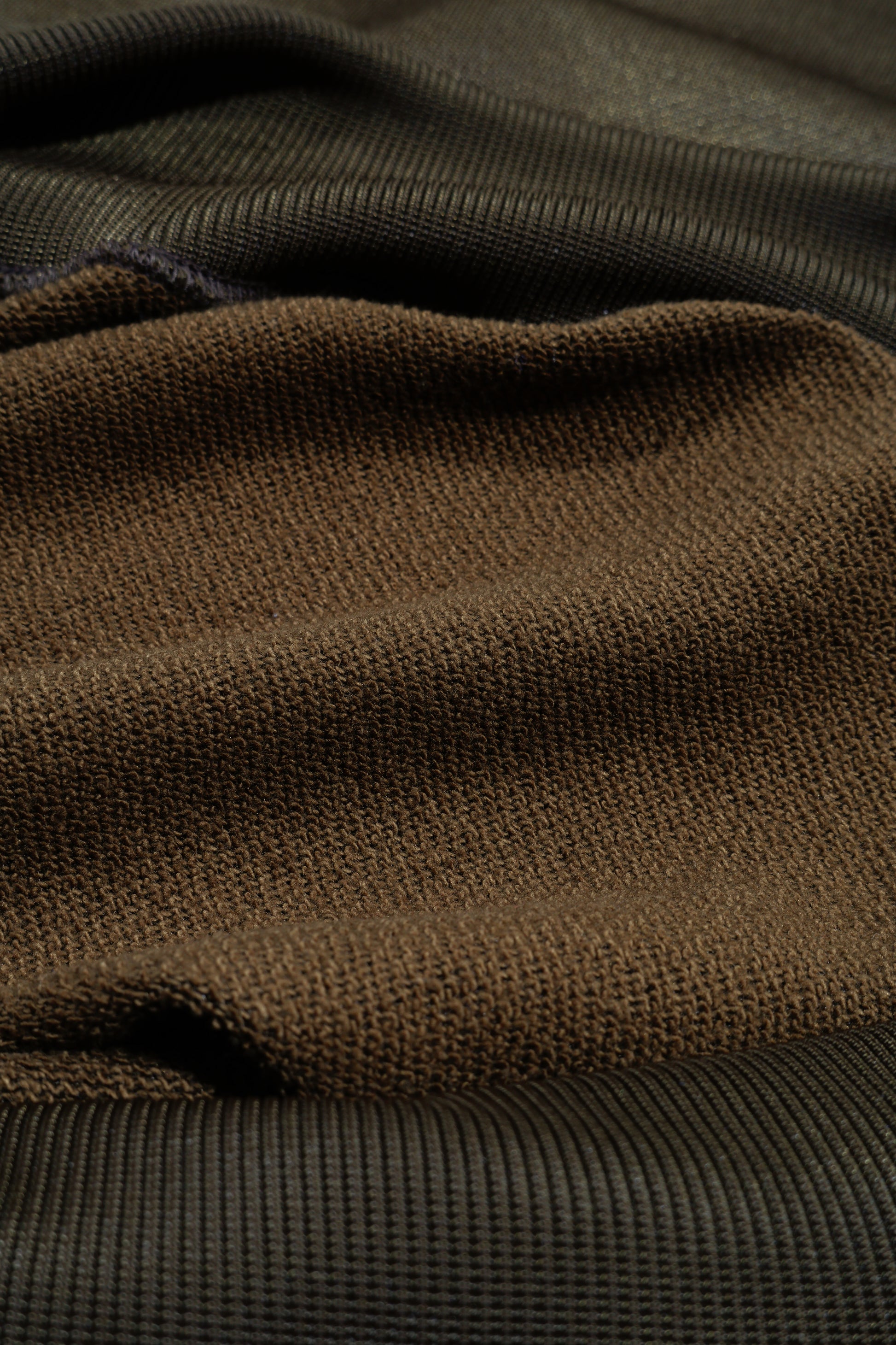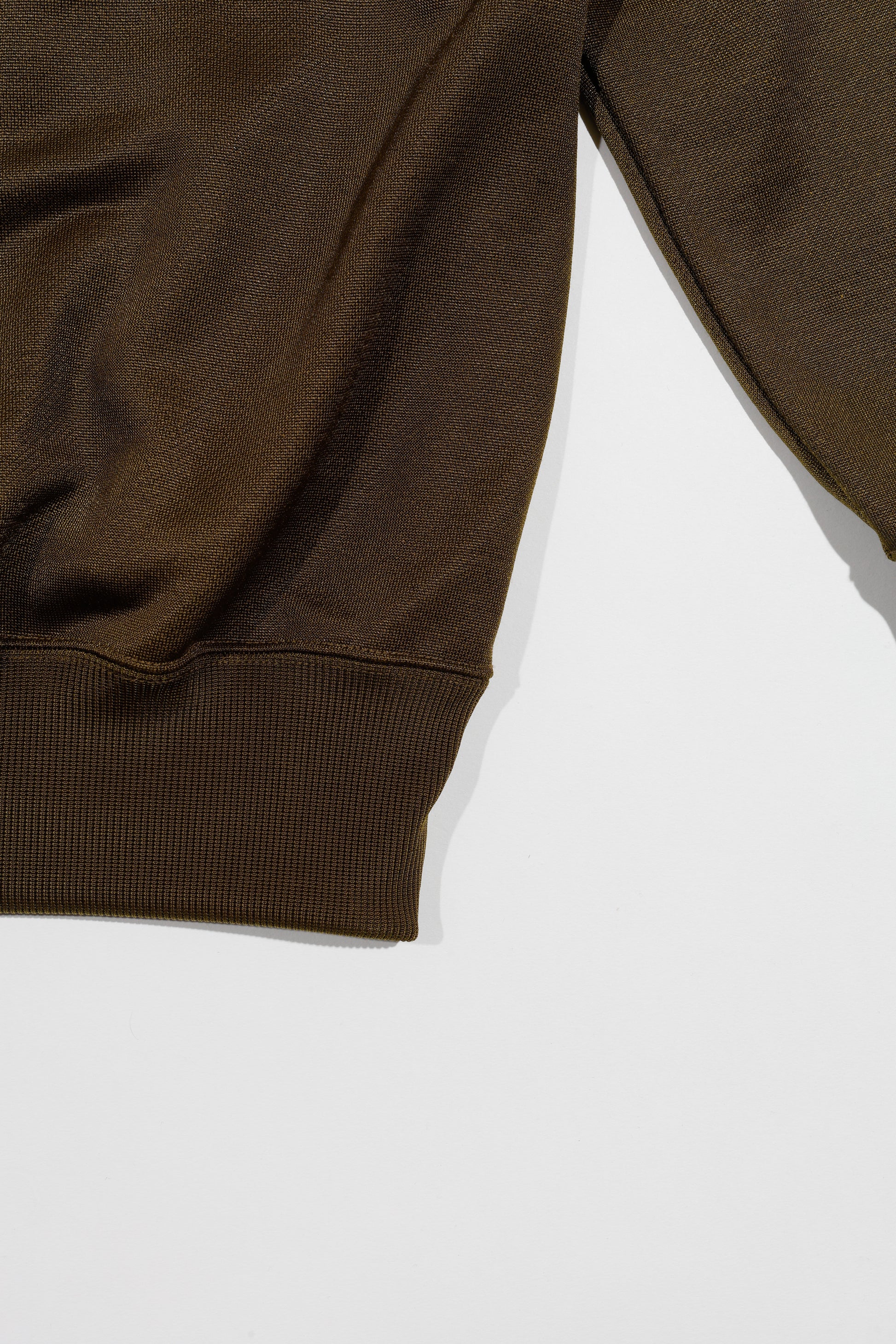 特殊なブライト糸を使用して和歌山にて編みたてられた生地は一見するとスポーティなジャージのような素材感をイメージするかと思いますが裏面(肌面)のループには超太番手のコットンを使用しているので安心感のある着心地と吸水性を持っています。